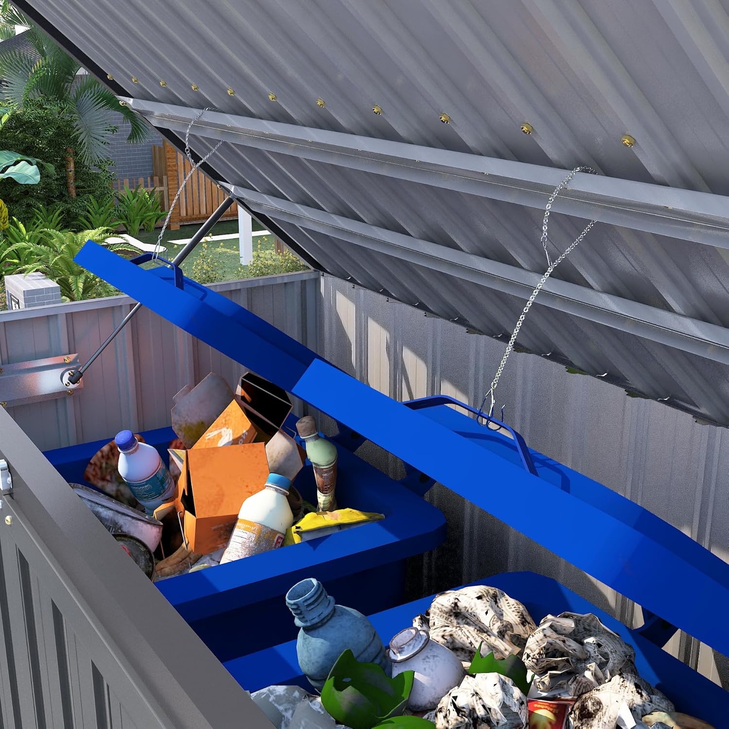 • Portability and Security: When used as an outdoor trash can storage, the design includes independent, upward-opening lid hooks that attach directly to the garbage can lid. A hydraulic mechanism ensures smooth opening and closing. Lockable double doors extend to 47 inches, allowing for the storage of longer items like bicycles and enhancing security, making it a versatile solution for both bike storage and outdoor storage.