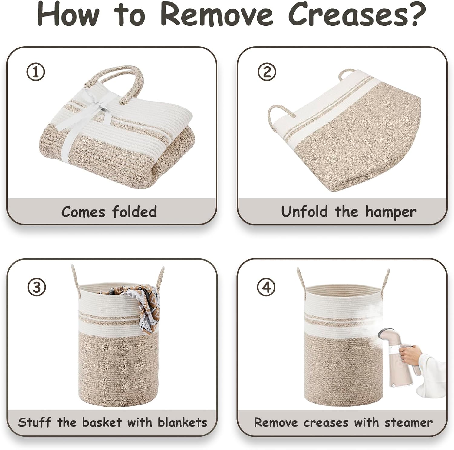 • ❤【Restore Elegant Shape】 To improve shipping efficiency, foldable woven rope hampers are packed compactly. You can put some blankets or small quilts in it and give it some time to regain its shape. Iron is a great idea to remove the creases.