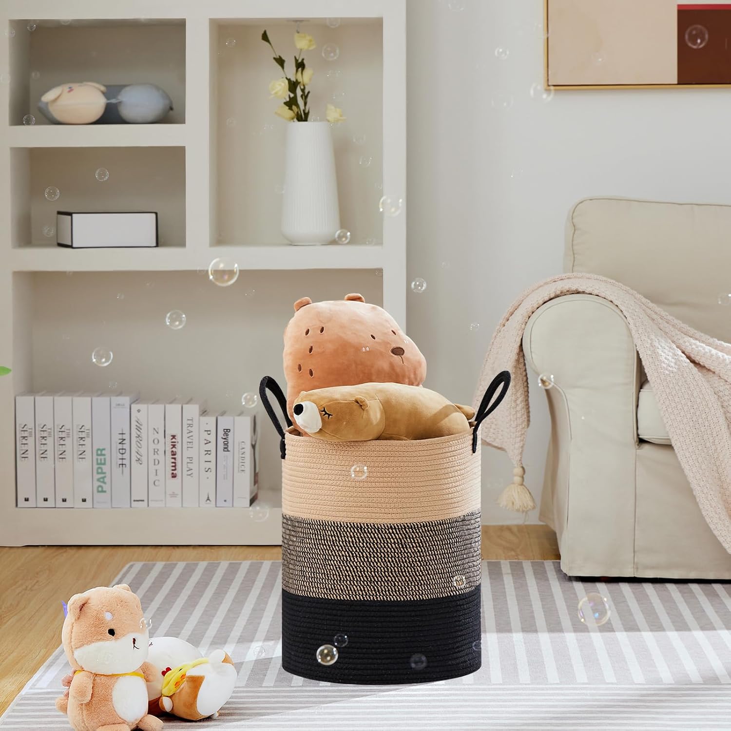VIPOSCO Large Laundry Hamper, Tall Woven Rope Storage Basket for Blanket, Toys, Dirty Clothes in Living Room, Bathroom, Bedroom - 53L Brown & Black