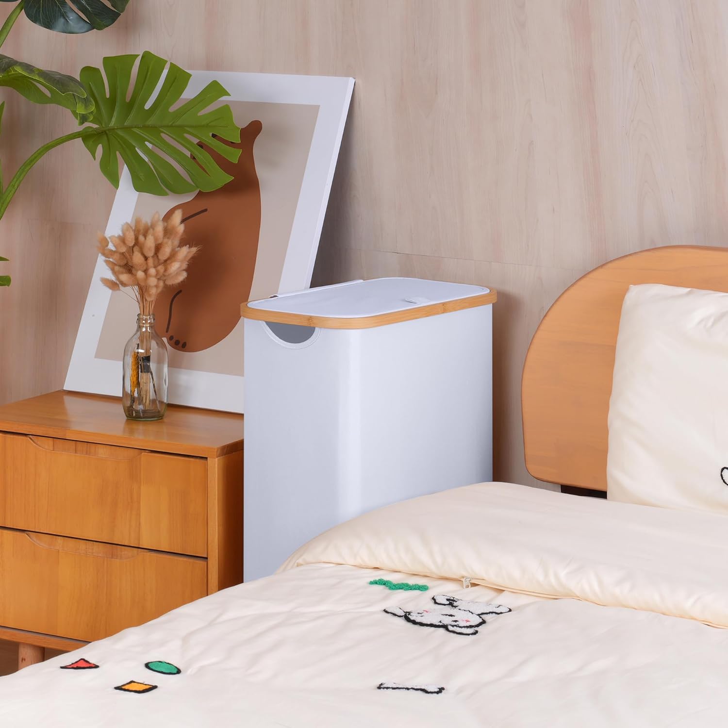 Slim Laundry Basket with Wheels,Narrow Hampers for Laundry,Freestanding Laundry Hamper with Lid&Bamboo Handles,Collapsible & Waterproof Tall Cloth Hamper for Dorm Family(60L White)