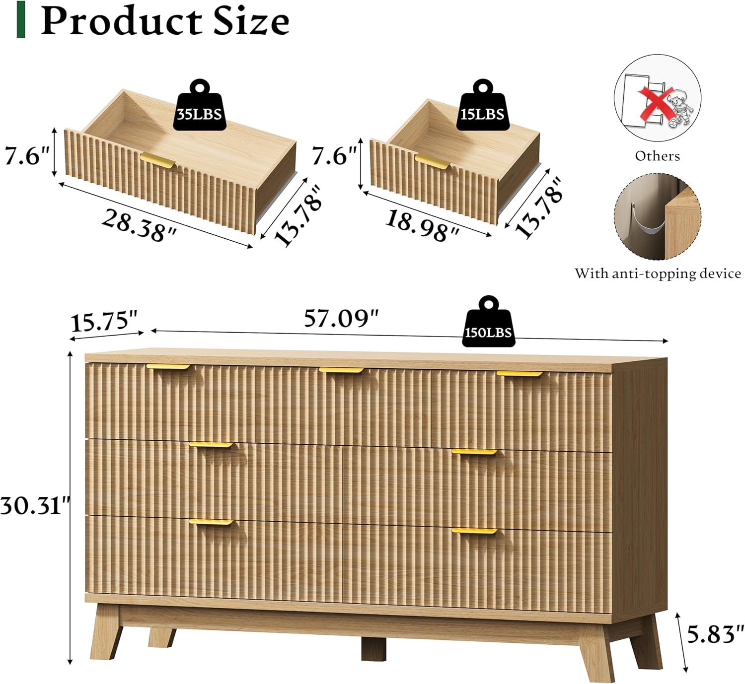 - 【Solid Material & Study Construction】The dressers & chests of drawers are constructed from optimal MDF, P2 engineered wood and coated metal handles which not only have exquisite texture, but also ensure long-term use and are scratch resistant. Each drawer holds up to 15 lbs or 35 lbs and the thickened tabletop can support up to 150 lbs. For easy cleaning, just wipe with damp cloth and get it air-dried