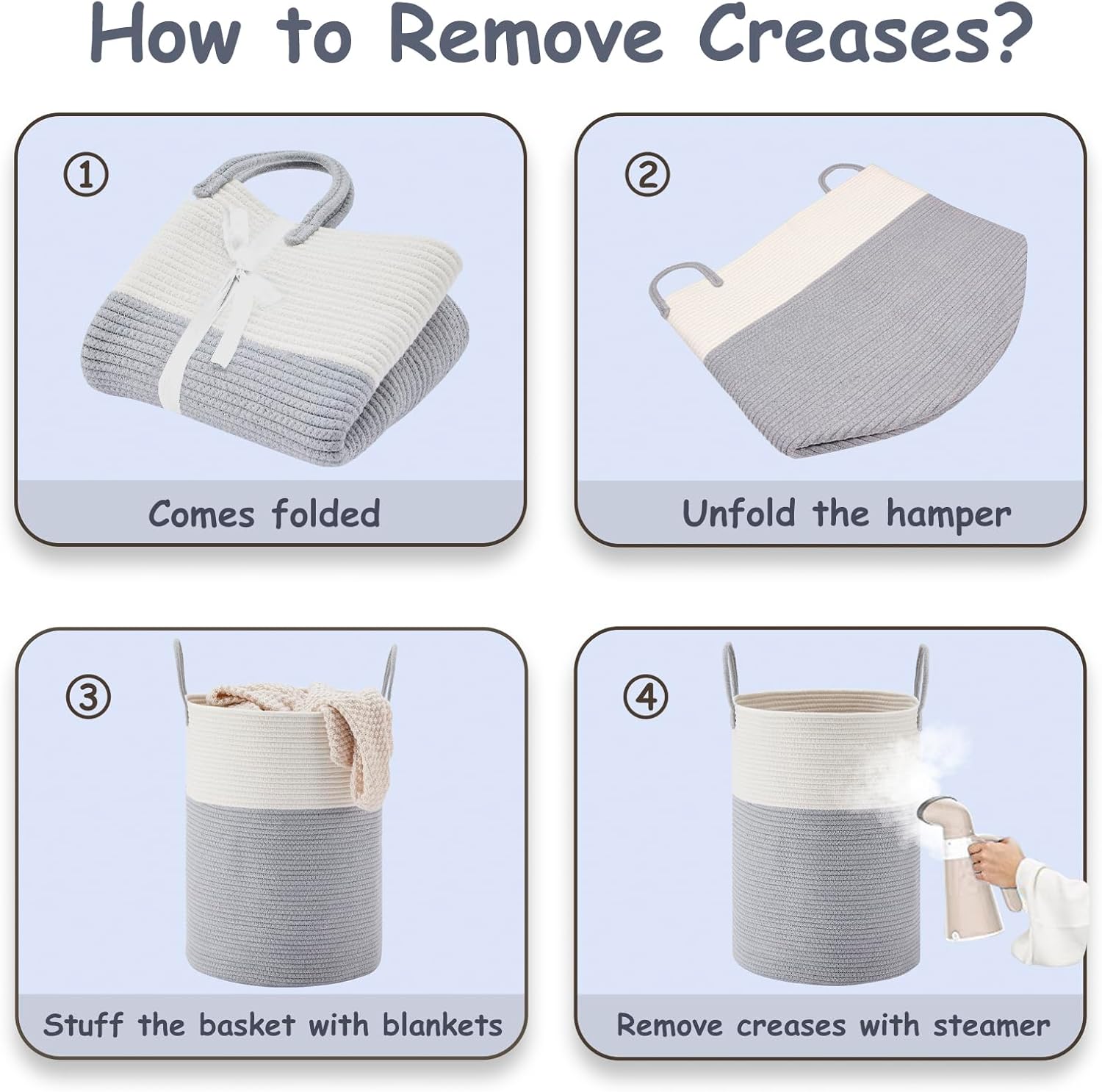 • ❤【Restore Elegant Shape】 To improve shipping efficiency, foldable woven rope hampers are packed compactly. You can put some blankets or small quilts in it and give it some time to regain its shape. Iron is a great idea to remove the creases.