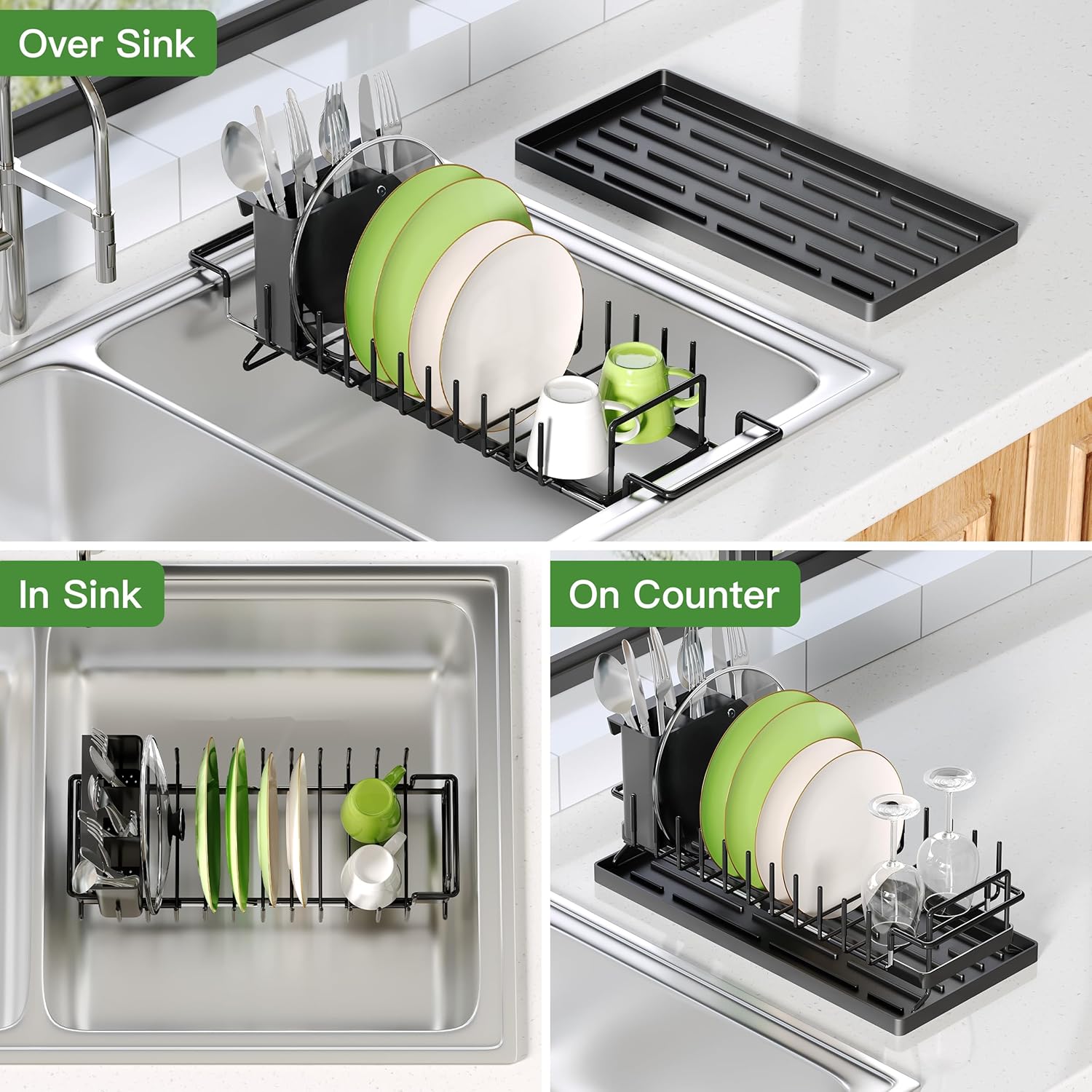 • 📍 Adjustable Sink Compatibility: Adjustable sink drying rack arms securely fit most sinks as over-the-sink dish rack or inside sink dish drying rack. Ideal for kitchens, apartments, and RVs.