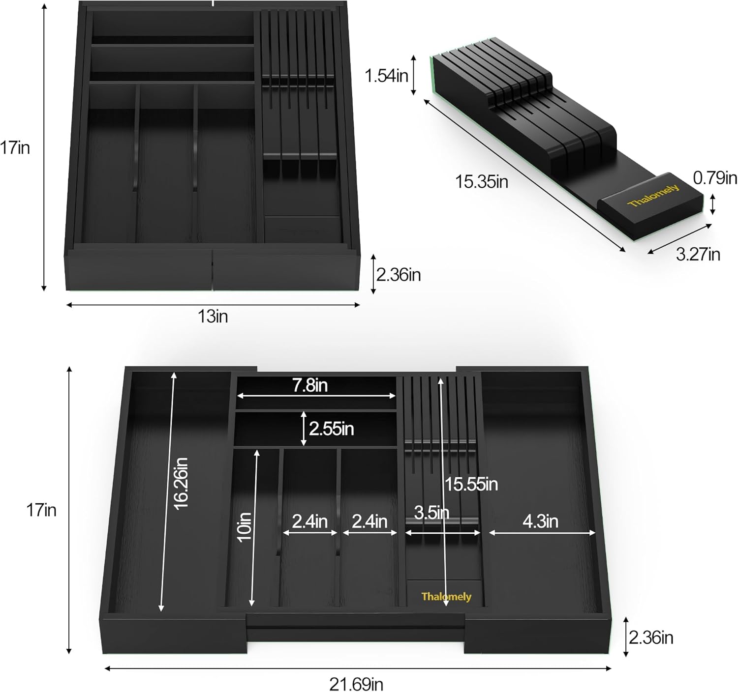 - Keep Your Kitchen Drawers Organized: When fully extended, it fits drawers up to 21.69 x 17 x 2.36 inches, and when fully collapsed, it fits drawers up to 13 x 17 x 2.36 inches. Featuring up to 8 compartments and a removable knife block, this organizer keeps your drawers tidy and practical, making it easy to find knives, forks, spoons, and other kitchen tools instantly. Say goodbye to messy jumbles and instantly find what you need.