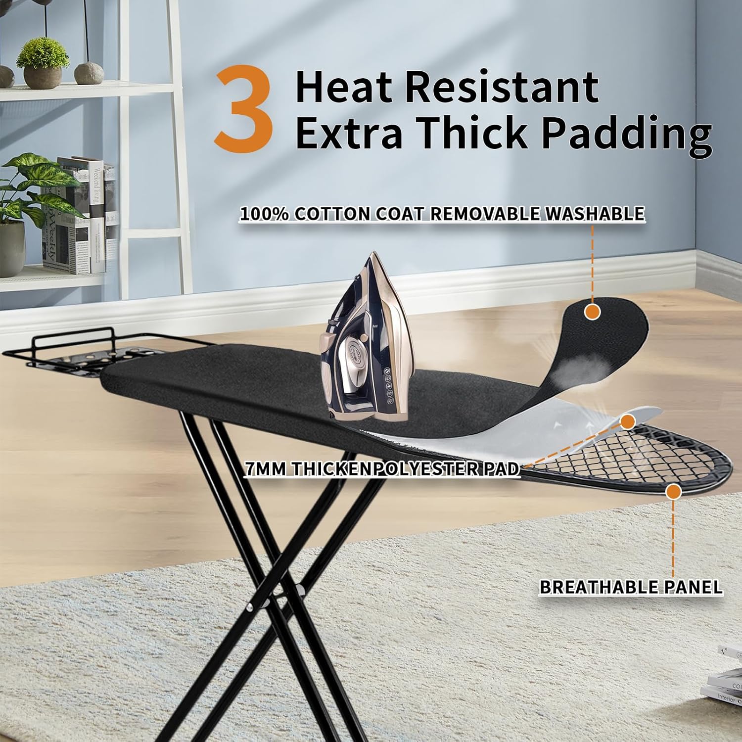 • Heat-resistant: This iron board utilizes heat-reflective needle-punched cotton and sponge padding for high-temperature resistance. Its breathable surface prevents lint buildup, ensuring fabrics remain perfect, and the removable cover is easy to clean