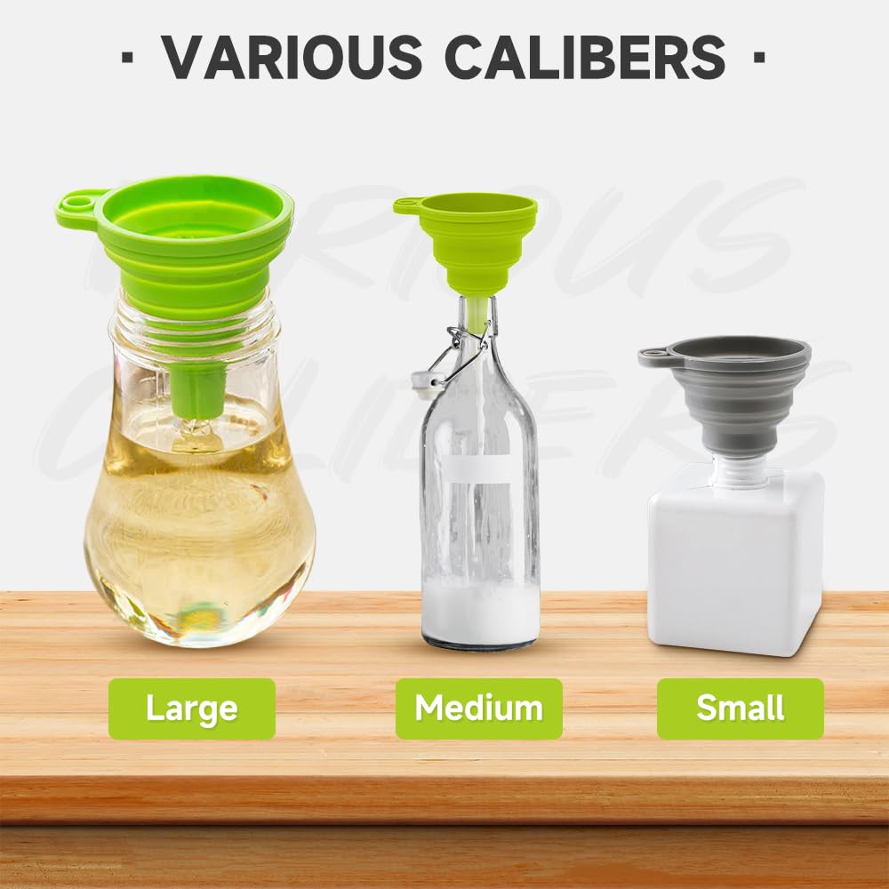- ✨ Collapsible & Space-Saving Design: Say goodbye to cluttered storage! Each funnel features a flexible, retractable design—ready to use when expanded, and collapses to an ultra-thin 2-3cm thickness for storage. When stacked, the three sizes take up no more space than the palm of your hand, fitting easily into drawers, storage boxes, or even a small carry pouch. Perfect for travel, camping, or everyday kitchen use.
