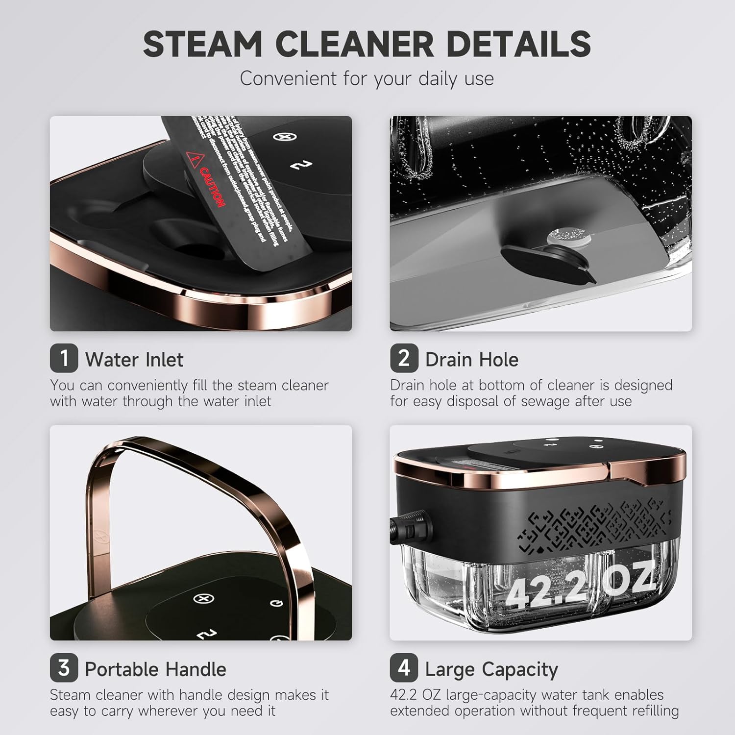 • 【ADJUSTABLE STEAM】The handheld steam cleaner features 6 levels of steam adjustment to precisely meet cleaning needs. The steamer with LED backlighting will display the real-time usage of the steamer. Powerful steam can instantly remove stubborn stains, saving time and effort.