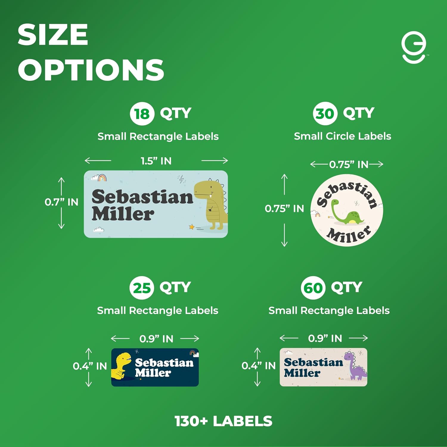 - ๐ Kids Stickers Pack of 130+ with Size Options โ This set includes 133 labels in three practical sizes to fit all your childโs essentials: 18 large (1.5" x 0.7"), 30 round (0.75"), and 85 mini (0.9" x 0.4"). Use them on water bottle stickers for kids, books, school supplies for kids, lunch containers, clothing, and moreโno item too big or too small!