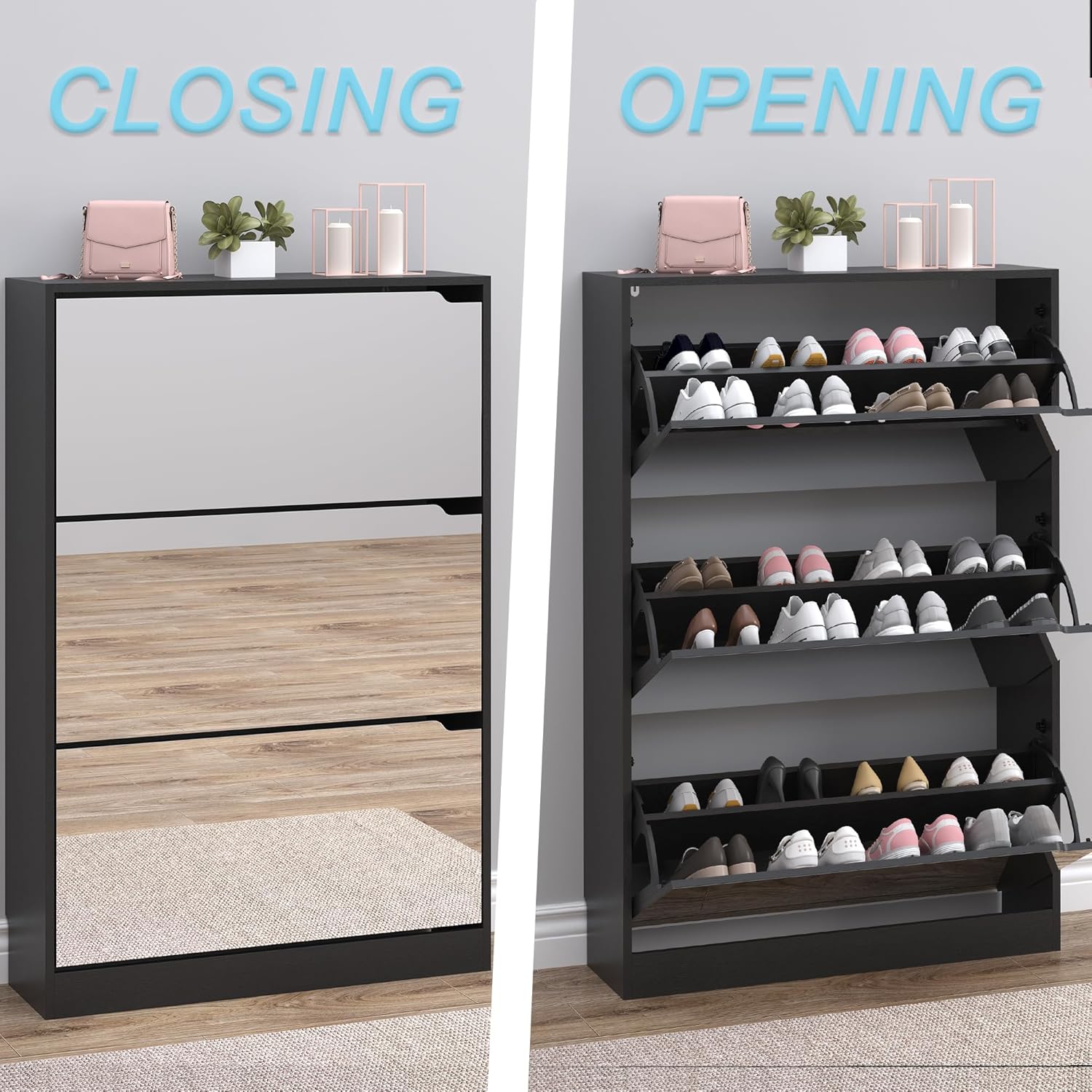 - Shoe Cabinet with Mirror for Entryway: BORNOON narrow shoe cabinet features a spacious full-length mirror, perfect for a quick outfit check before heading out. It combines practicality and style, making it’s easily to select your shoes and get a final look at your outfit. Placed conveniently near your entryway, hallway or it enhances your daily routine with both function and fashion.