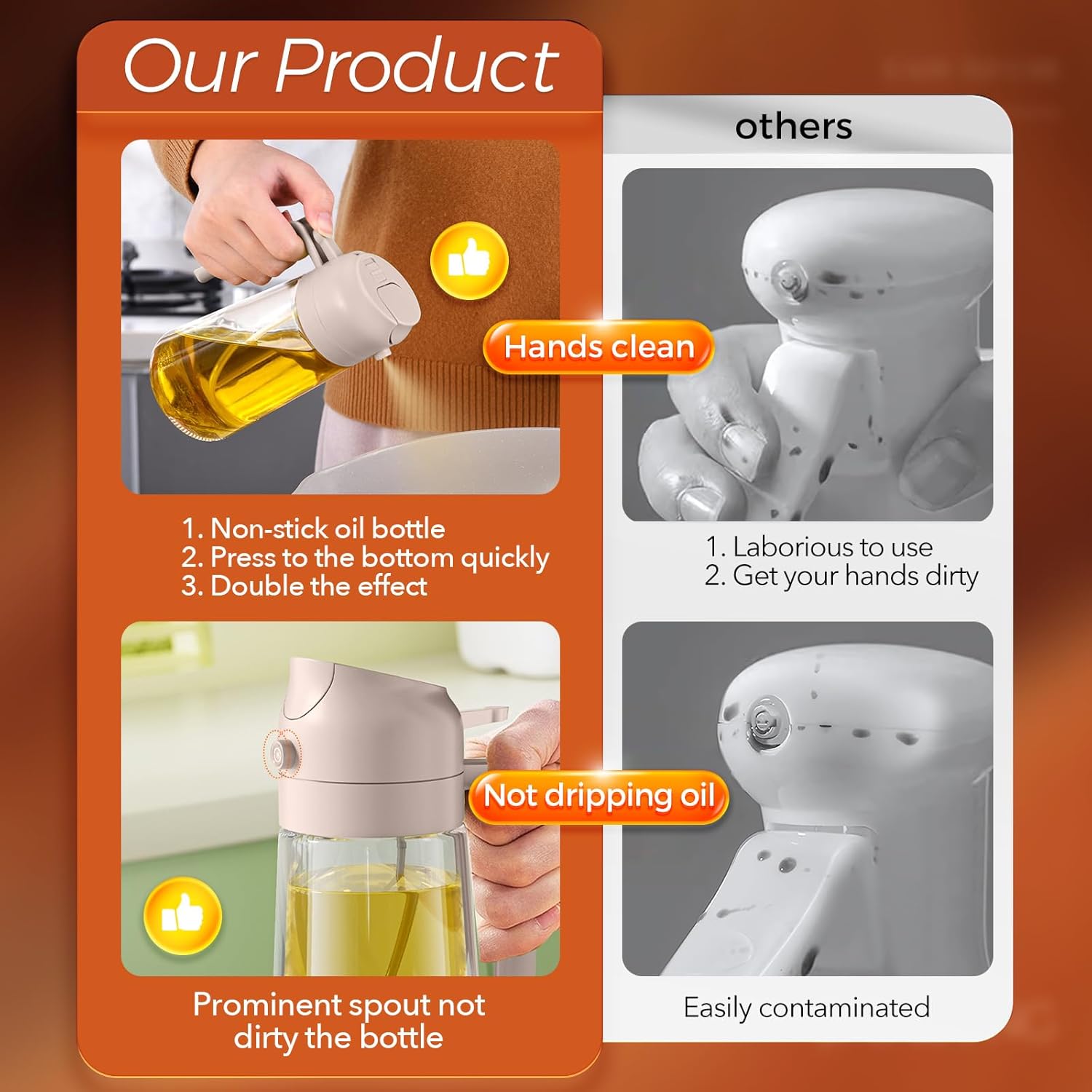 • Precise Oil Control: Cooking spray bottle can help to control the amount of oil while pouring or spraying. Each spray dispenses approximately 0.2 grams of oil, which is easily to control and measure your daily oil intake