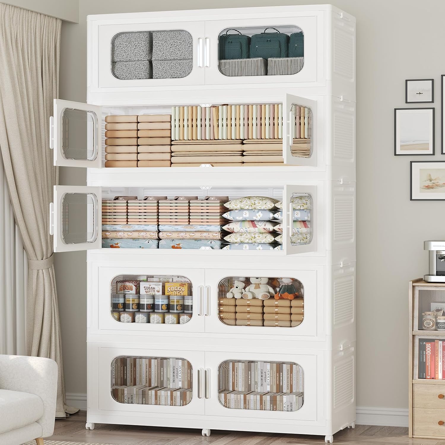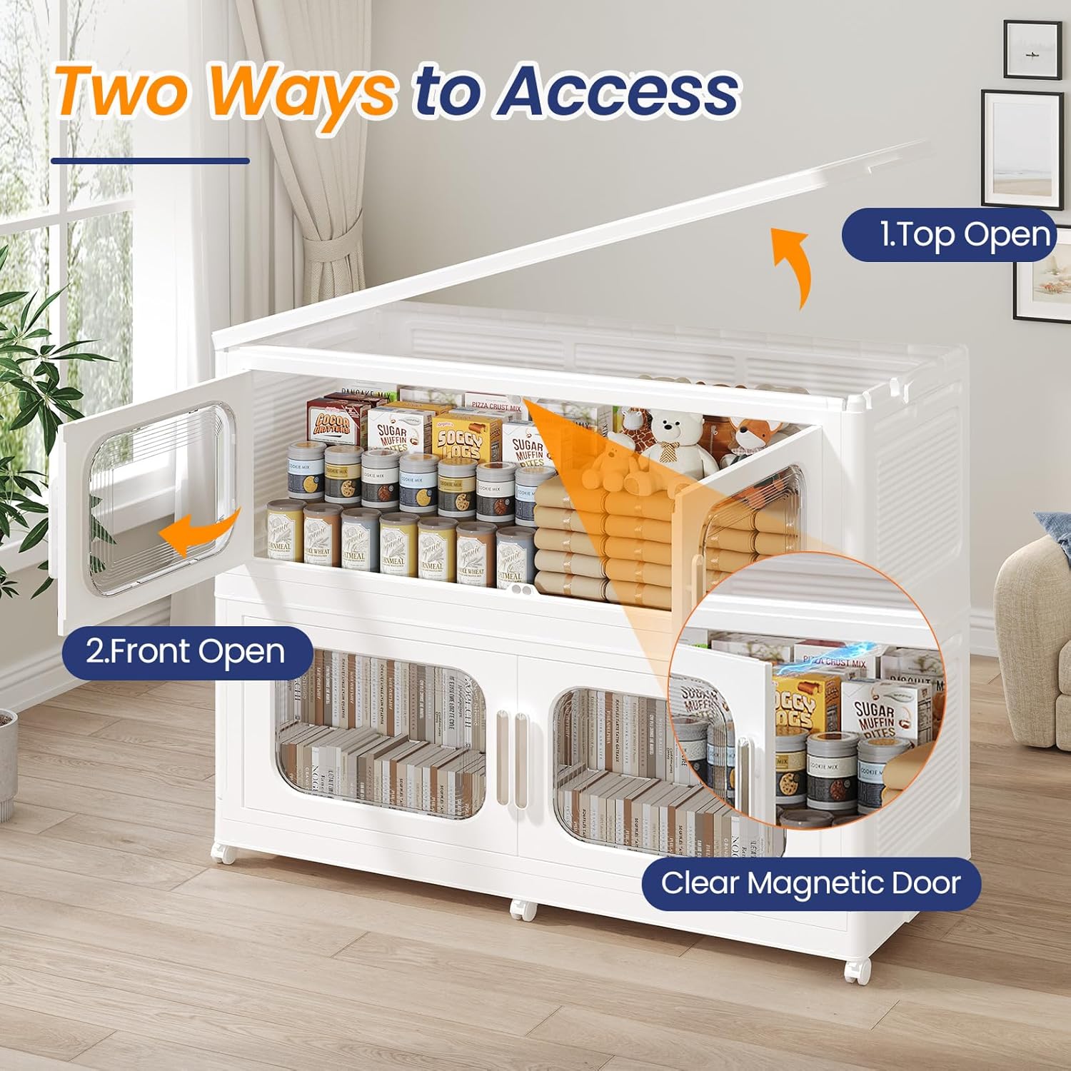 - 【Two Ways to Open & Magnetic Easy Access】The collapsible storage bins with doors and wheels feature a dual access way, allowing for both top and front door openings, and with clear brown windows for easy visibility. The extra large storage bins with open front doors are equipped with magnetic lock buckles to prevent dust from entering the cabinet.