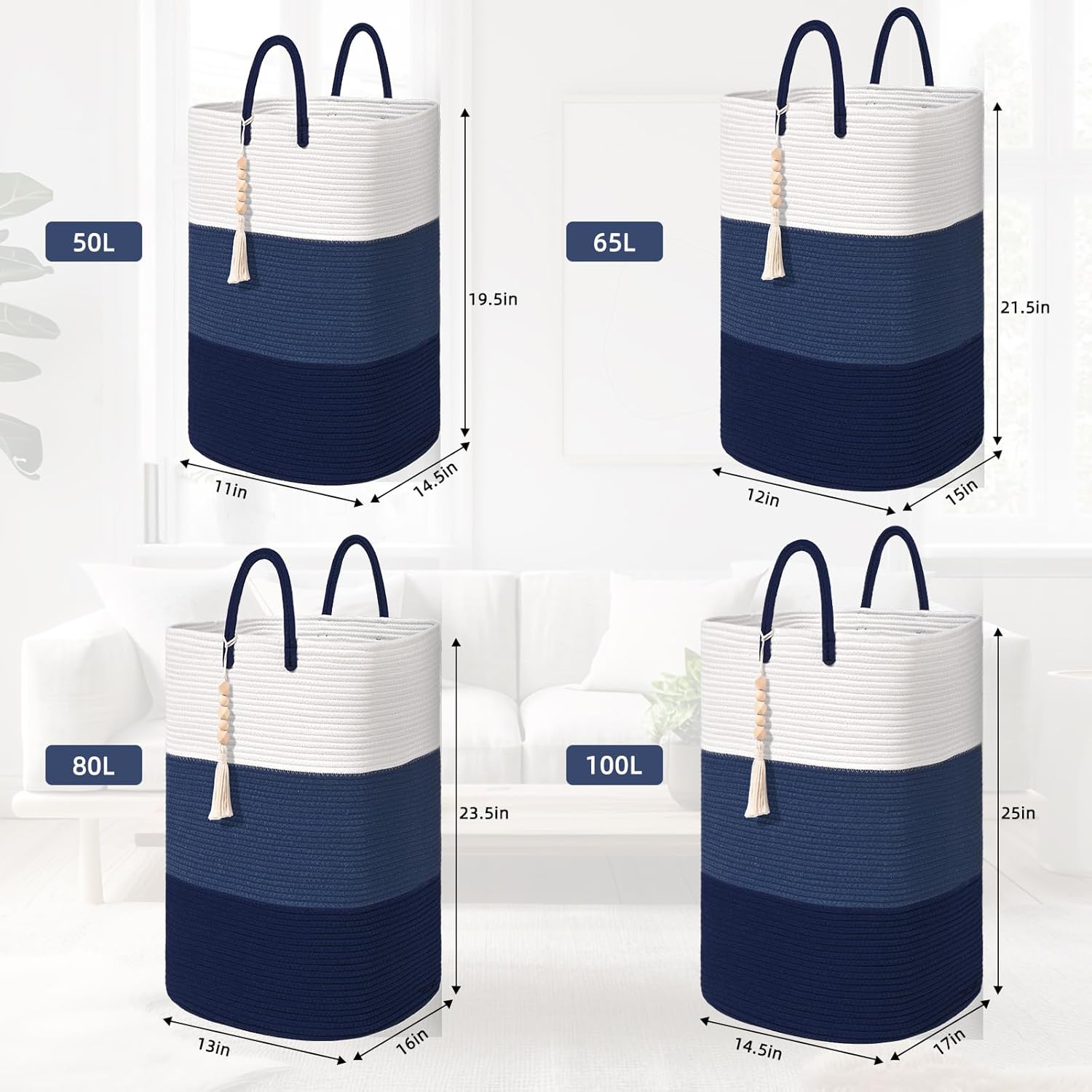• ๐ŸŒˆ[DURABLE, BREATHABLE & SKIN - FRIENDLY COTTON]: Made of sturdy and odor-free rope cotton, woven laundry basket has a solid addition to any space. Tall laundry basket quite sturdy and spacious, capable of holding a good amount without losing its shape, which adds to its practicality.