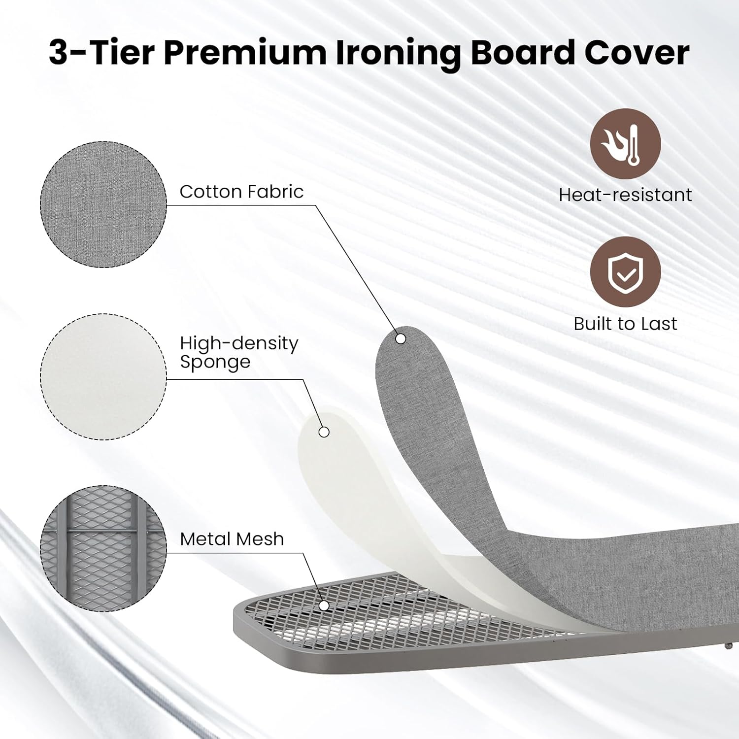 • 3-Layer Premium Cover: The 42" x 14.5" ironing surface of this ironing board is equipped with a 3-tier ironing board cover, including a cotton fabric outer layer, a high-density sponge filling and a bottom metal mesh, offering a heat-resistant and built-to-last ironing experience.
