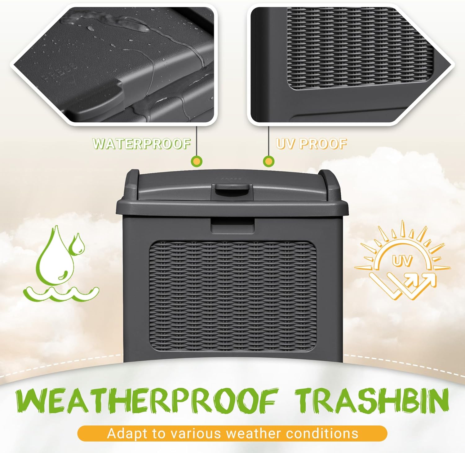 • Resin Trash Can: Made of resin material, the trash bin is waterproof&UV-proof.