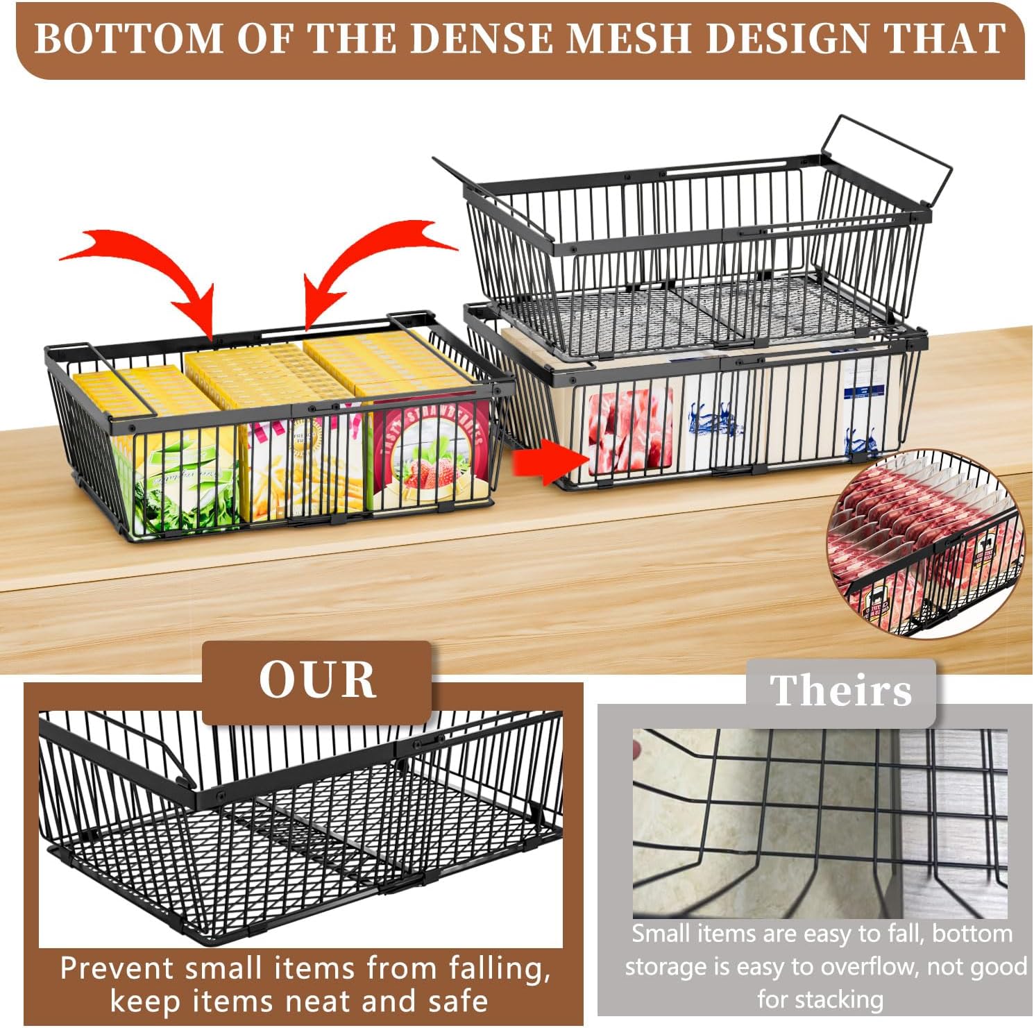 - Upgraded Anti-Leakage Mesh Bottom: To prevent small items from falling and spilling out of the bottom, the chest freezer organizer bins have an upgraded sturdy mesh bottom. freezer baskets are designed to keep items organized and secure. freezer organizer has non-slip beads on the bottom for added stability, making it ideal for stacking. Stackable.