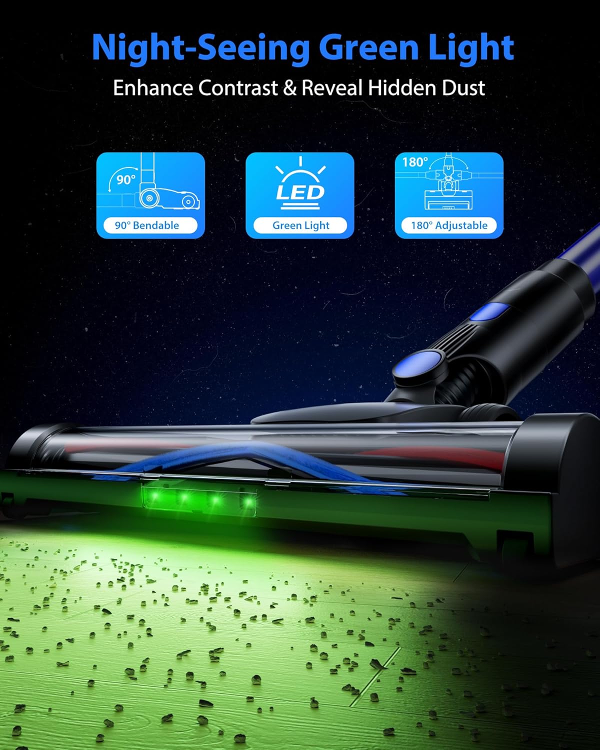 - 𝐒𝐜𝐢𝐞𝐧𝐭𝐢𝐟𝐢𝐜 𝐆𝐫𝐞𝐞𝐧 𝐋𝐢𝐠𝐡𝐭 𝐟𝐨𝐫 𝐂𝐥𝐞𝐚𝐫𝐞𝐫 𝐂𝐥𝐞𝐚𝐧𝐢𝐧𝐠 - The floor brush's 520nm green LED exposes hidden dust while reducing glare. Its adjustable head reaches tight spaces, eliminating furniture-moving hassles.