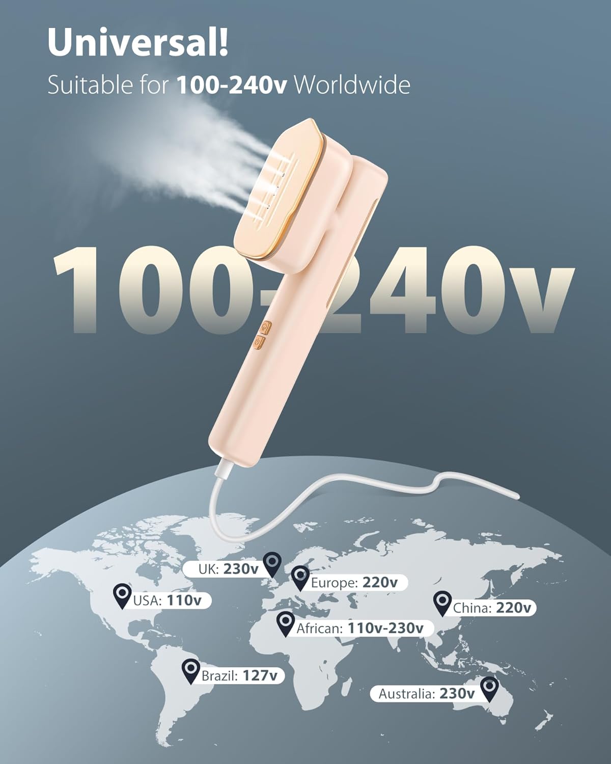 - Suitable for All Fabrics: Whether at home or on the go, this portable steamer is perfect for ironing a variety of clothes. It works well on all fabrics including T-shirts, shirts, coats, wool, denim, curtains, furniture, toys, silk, lace, and more. Designed for use in 100-240V countries and regions like the US, Canada, and Japan.