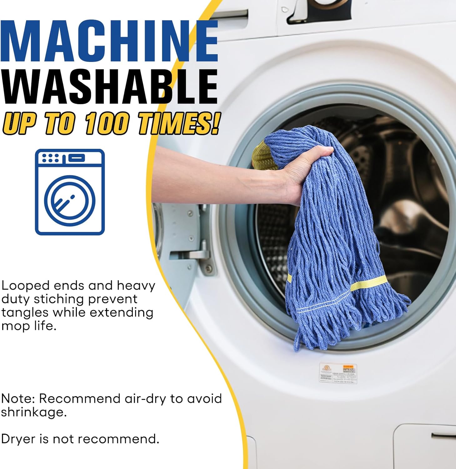 • Washable and Long-Lasting: Commercial mop heads are launderable for extended long-term usage. Long-lasting fibers allow the mop head to be washed many times giving it a longer service life. This washable mop head is launderable up to 100 times! NOTE: Do not use dryer after laundering to avoid shrinkage and loosen string, air-drying is recommended.