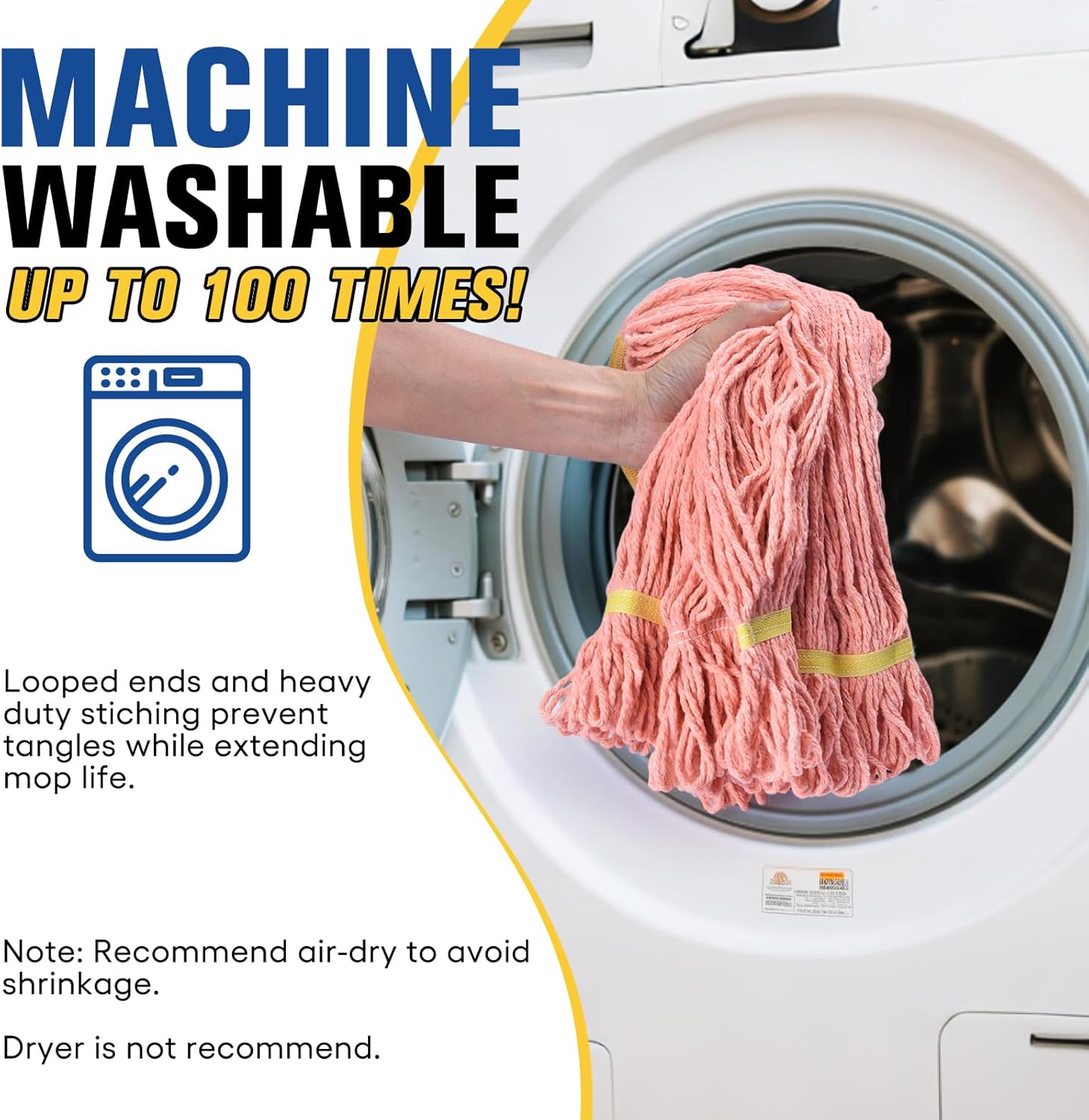 • Washable and Long-Lasting: Commercial mop heads are launderable for extended long-term usage. Long-lasting fibers allow the mop head to be washed many times giving it a longer service life. This washable mop head is launderable up to 100 times! NOTE: Do not use dryer after laundering to avoid shrinkage and loosen string, air-drying is recommended.