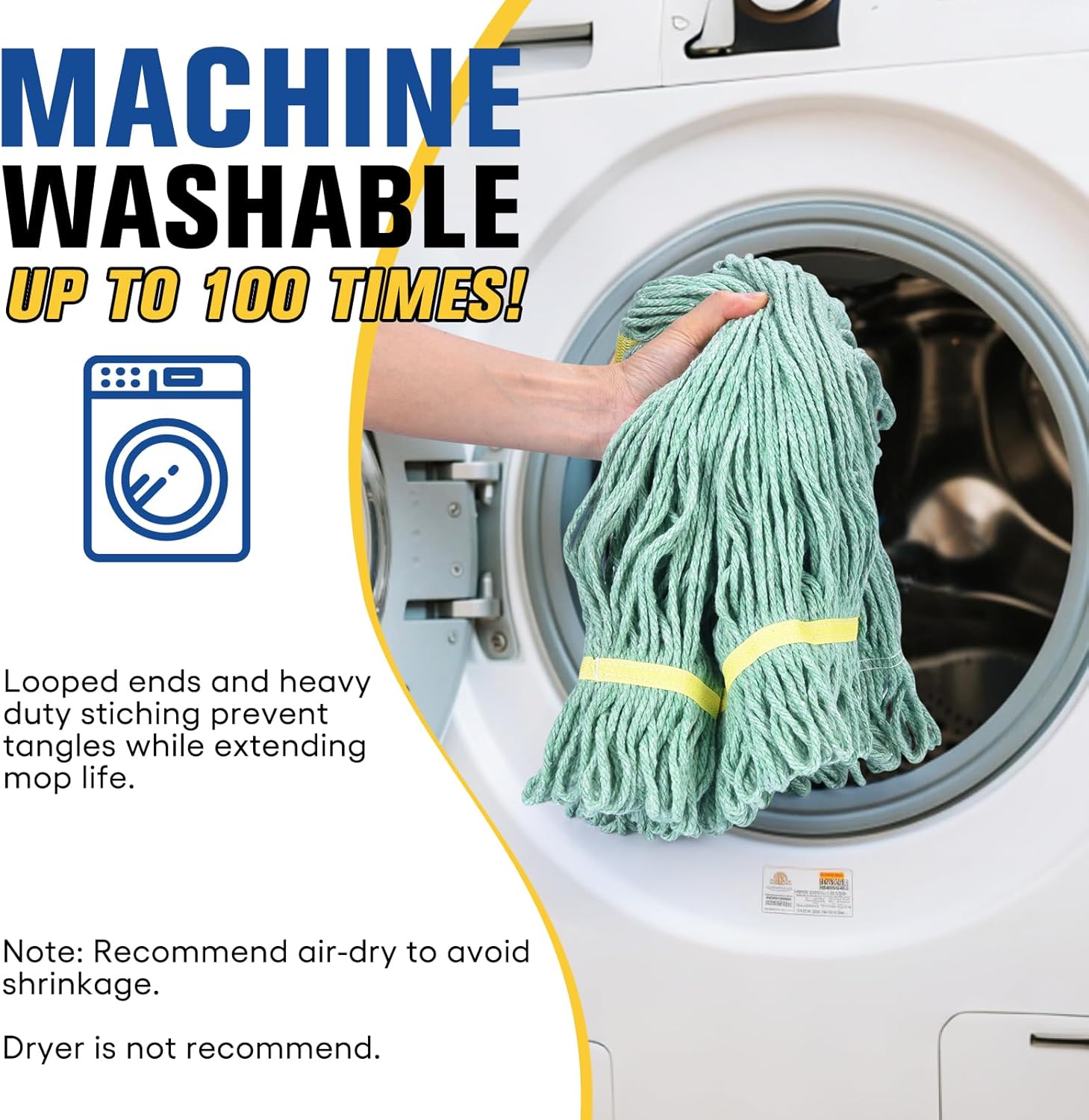 • Washable and Long-Lasting: Commercial mop heads are launderable for extended long-term usage. Long-lasting fibers allow the mop head to be washed many times giving it a longer service life. This washable mop head is launderable up to 100 times! NOTE: Do not use dryer after laundering to avoid shrinkage and loosen string, air-drying is recommended.
