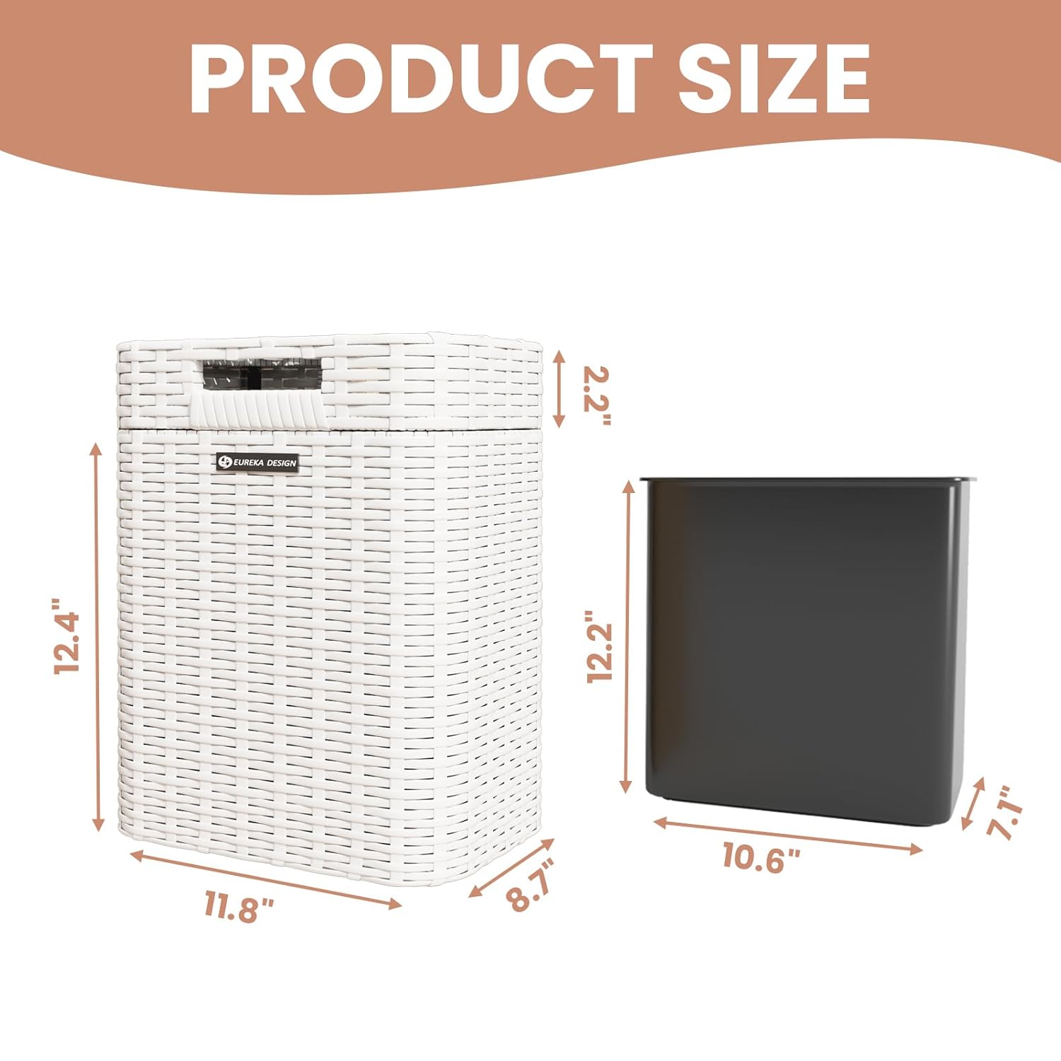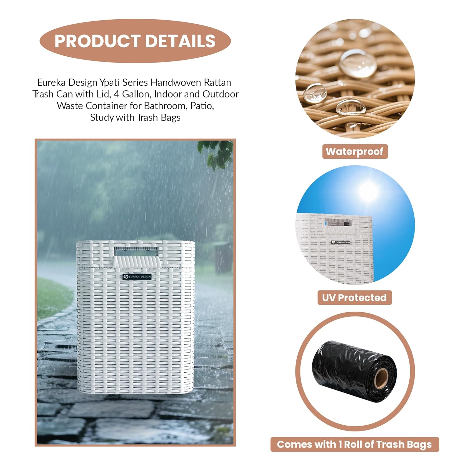 Ypati Handwoven 4 Gallon Rattan Trash Can with Lid, Boho Style Decorative Indoor and Outdoor Trash Bin with Shelf, Waste Basket for Bathroom, Patio, Study, with Trash Bags, Porcelain White, Eureka