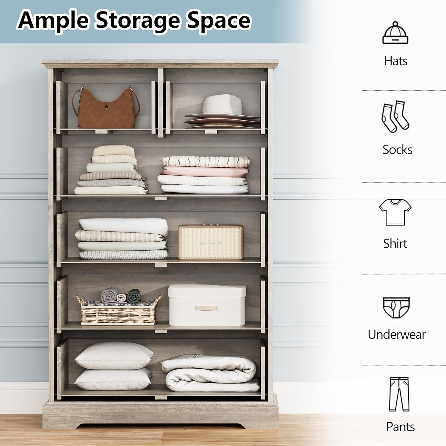 - Ample & Versatile Storage: Measuring 48.62"H × 15.75"D × 31.5"W, it features two smaller top drawers and four larger bottom drawers, providing the perfect combination of organization and accessibility. The top drawers are ideal for jewelry, accessories, or smaller essentials, while the spacious bottom drawers accommodate clothing, bedding, or bulkier items. Perfect as a tall dresser organizer or a storage dresser for bedrooms, closets, hallways, or living rooms, it keeps your items neatly sorted and your space elegant.