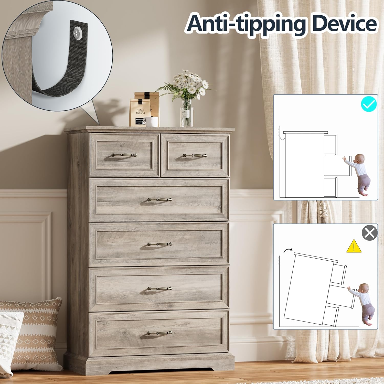 - Durable & Stable Construction: Crafted from high-density engineered wood, this sturdy piece is built to last. Strong legs and a thick top support up to 180 lbs. For added safety, an anti-tip device on the back panel keeps the dresser secure, making it a reliable storage solution for any room.