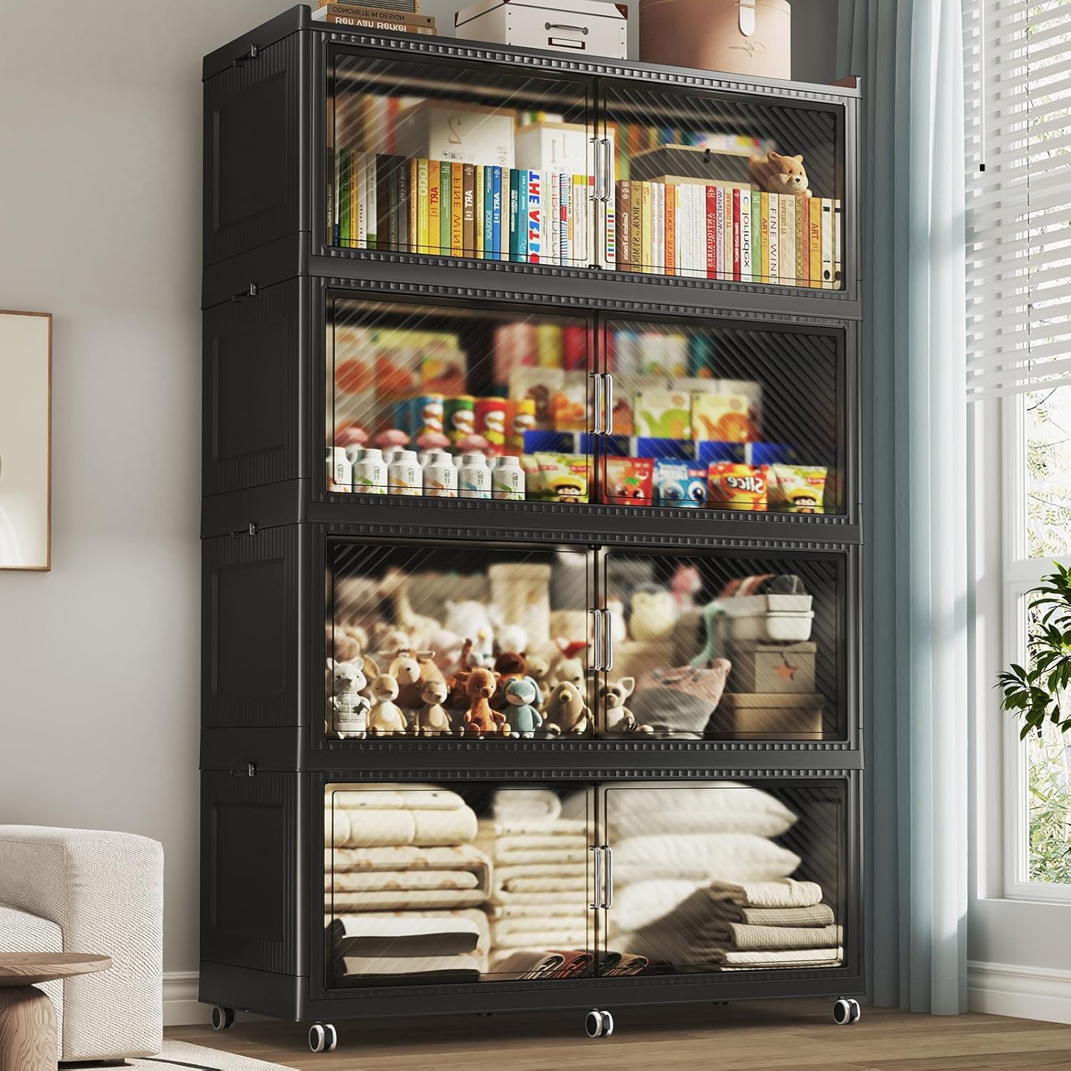 - 【Two Ways to Open & Magnetic Doors】The collapsible storage bins with lids and wheels feature a dual access way, allowing for both top and front door openings, and with clear brown windows for easy visibility. The super huge storage bins with open front doors are equipped with magnetic lock buckles to prevent dust from entering the cabinet.