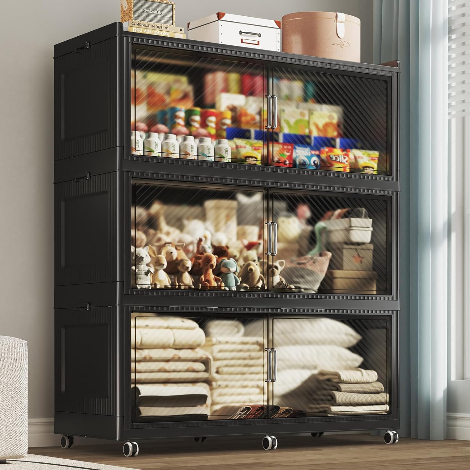 - 【Two Ways to Open & Magnetic Doors】The collapsible storage bins with lids and wheels feature a dual access way, allowing for both top and front door openings, and with clear brown windows for easy visibility. The super huge storage bins with open front doors are equipped with magnetic lock buckles to prevent dust from entering the cabinet.
