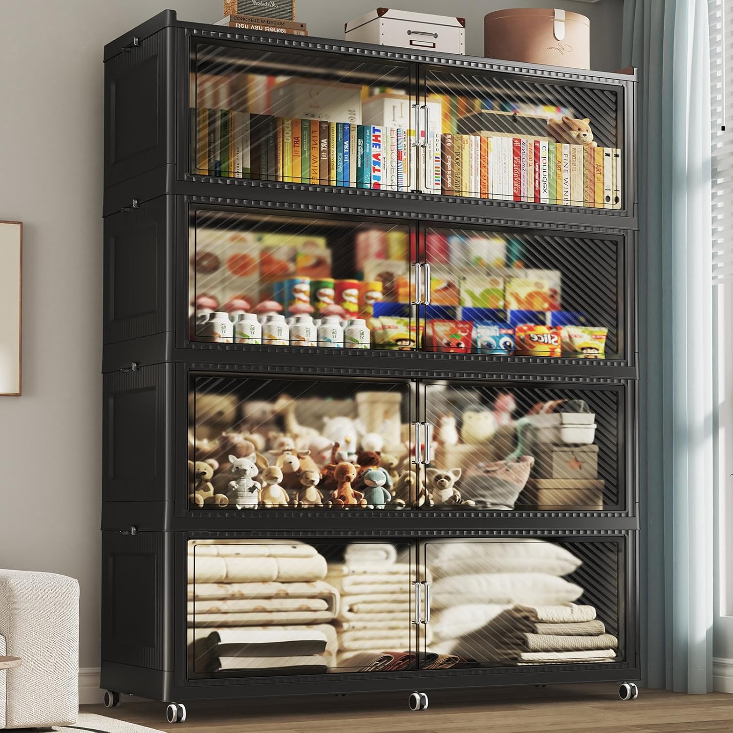 - 【Two Ways to Open & Magnetic Doors】The collapsible storage bins with lids and wheels feature a dual access way, allowing for both top and front door openings, and with clear brown windows for easy visibility. The super huge storage bins with open front doors are equipped with magnetic lock buckles to prevent dust from entering the cabinet.