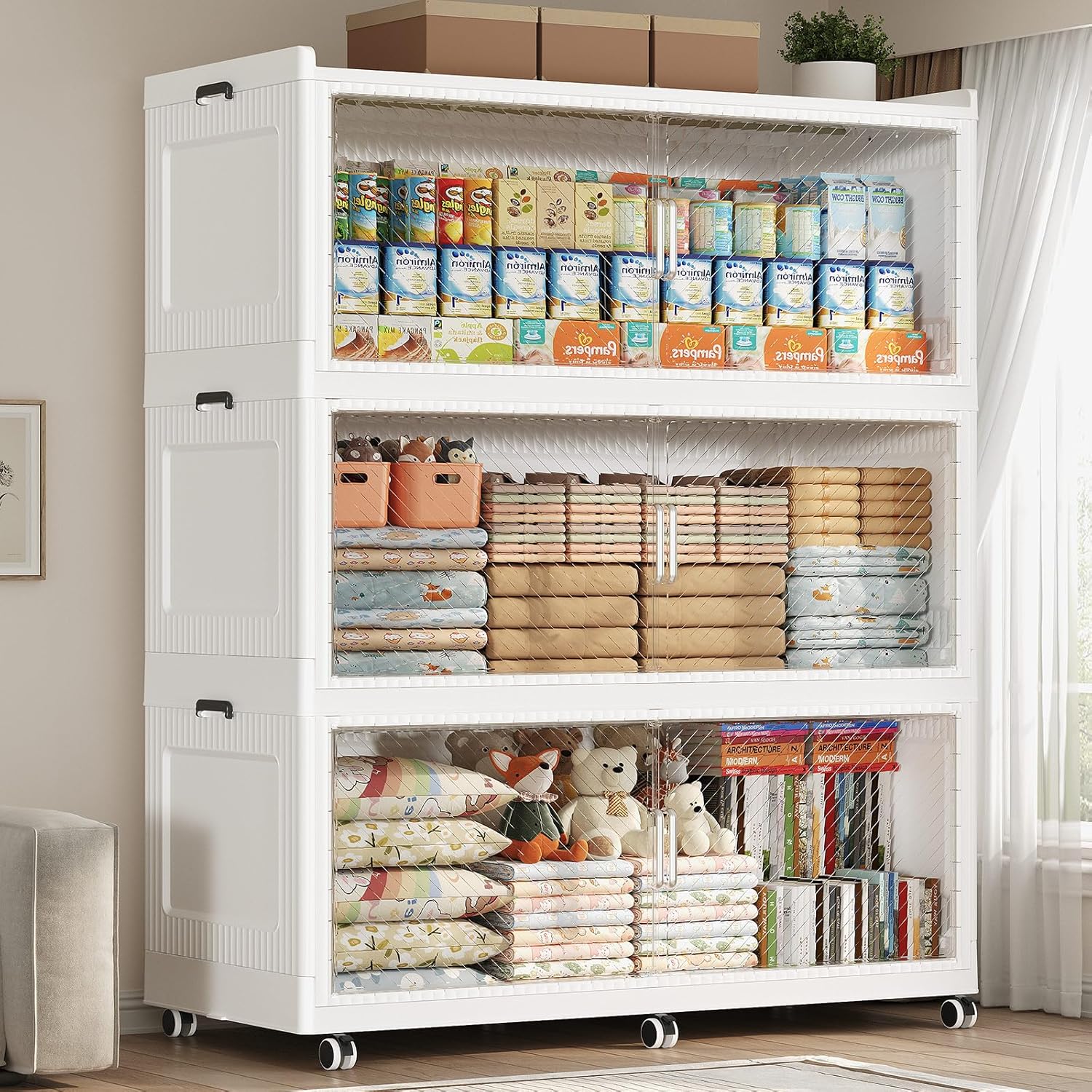 - 【Two Ways to Open & Magnetic Doors】The collapsible storage bins with lids and wheels feature a dual access way, allowing for both top and front door openings, and with clear brown windows for easy visibility. The super huge storage bins with open front doors are equipped with magnetic lock buckles to prevent dust from entering the cabinet.