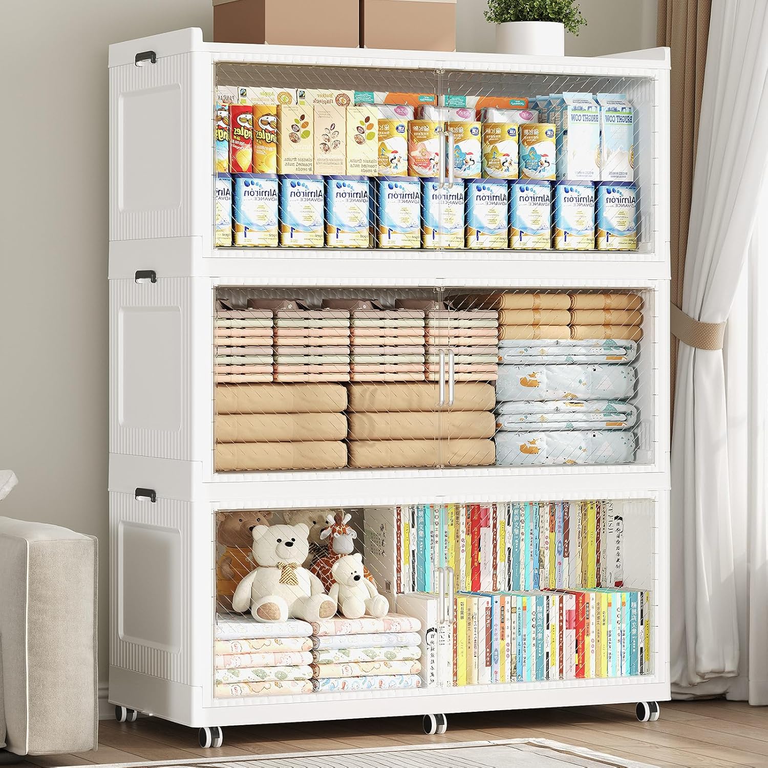 - 【Two Ways to Open & Magnetic Doors】The collapsible storage bins with lids and wheels feature a dual access way, allowing for both top and front door openings, and with clear brown windows for easy visibility. The super huge storage bins with open front doors are equipped with magnetic lock buckles to prevent dust from entering the cabinet.