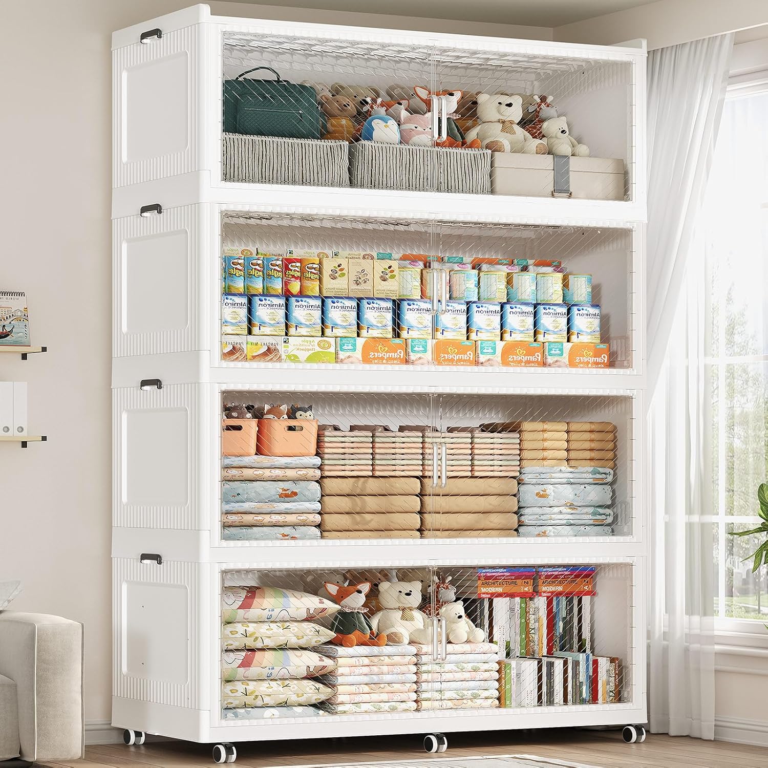 320GAL Extra Large Storage Bins with Lid, 1280QT Collapsible Organizer with Wheels, Stackable Closet Cabinet with Doors, Folding Storage Containers for Home, Office, Dorm, 4Pack White
