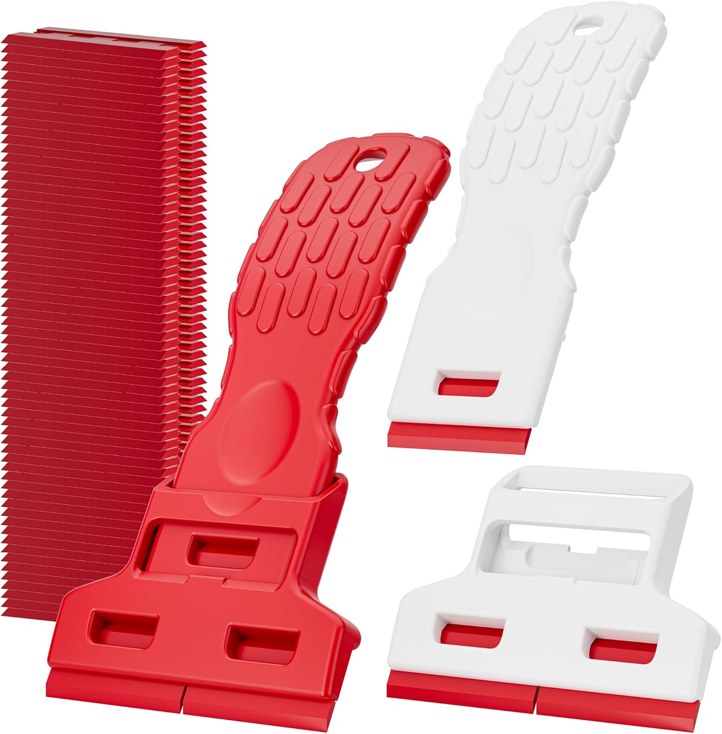 • 2 SCRAPERS INCLUDED — One red and one white scraper, identical function and textured non-slip grip; compact size fits toolbox, glovebox or kitchen drawer; ready to use out of the box.