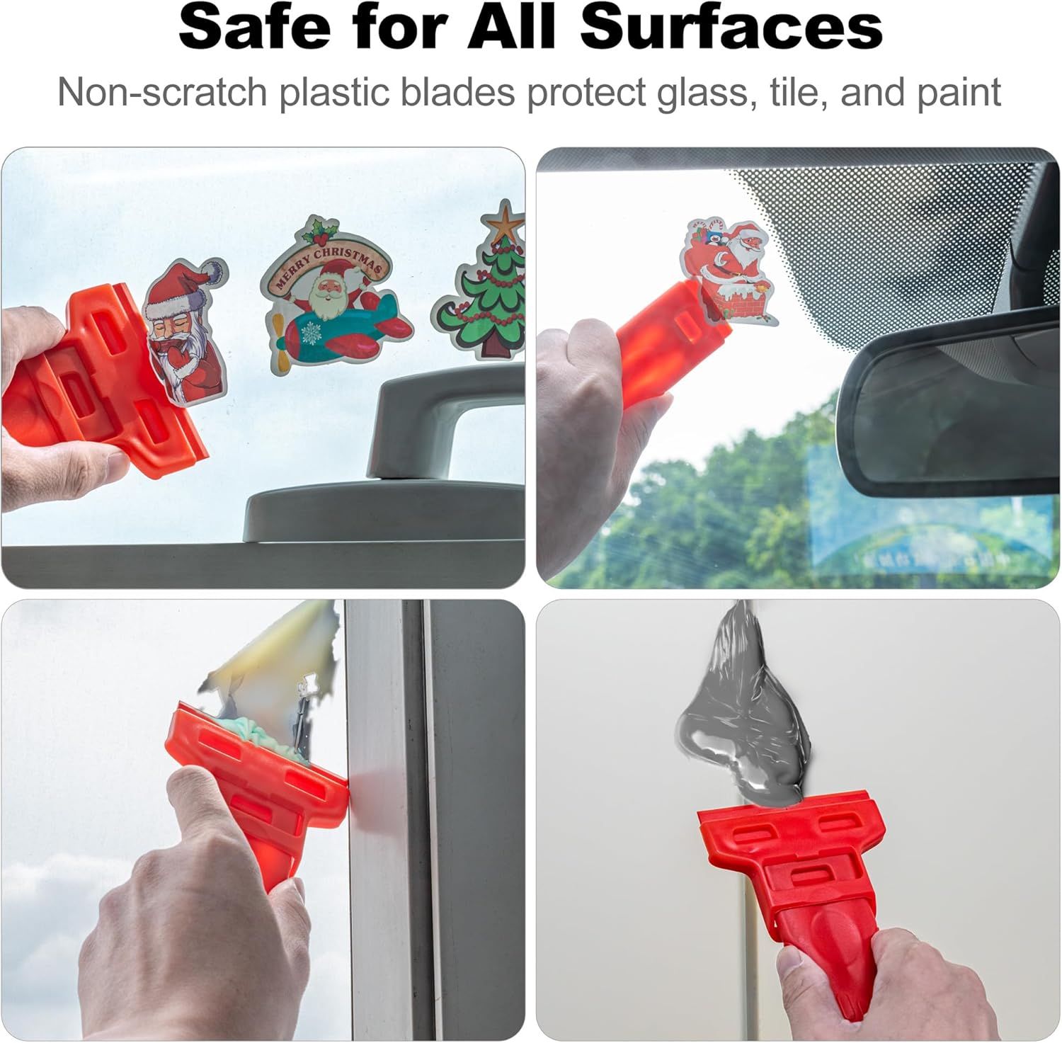 • SURFACE-SAFE, NON-SCRATCH — Plastic edges lift stickers, decals, tape and paint specks without scratching glass, tile, or paint; ideal for cooktops, shower doors and car windows.