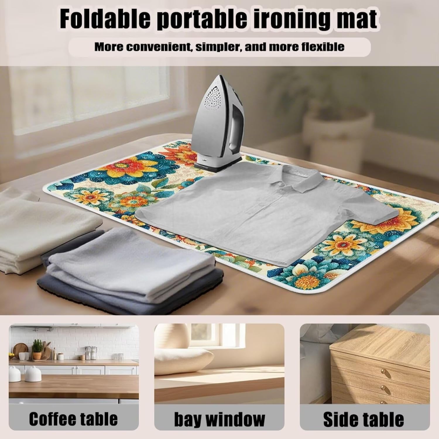 Boho Ironing Mat Foldable Ironing Pad Portable Board Iron Board Alternative Cover,Foldable Cover Flower Small Iron Mat for Table Top,Washer and Dryer 32 x 16 Inch