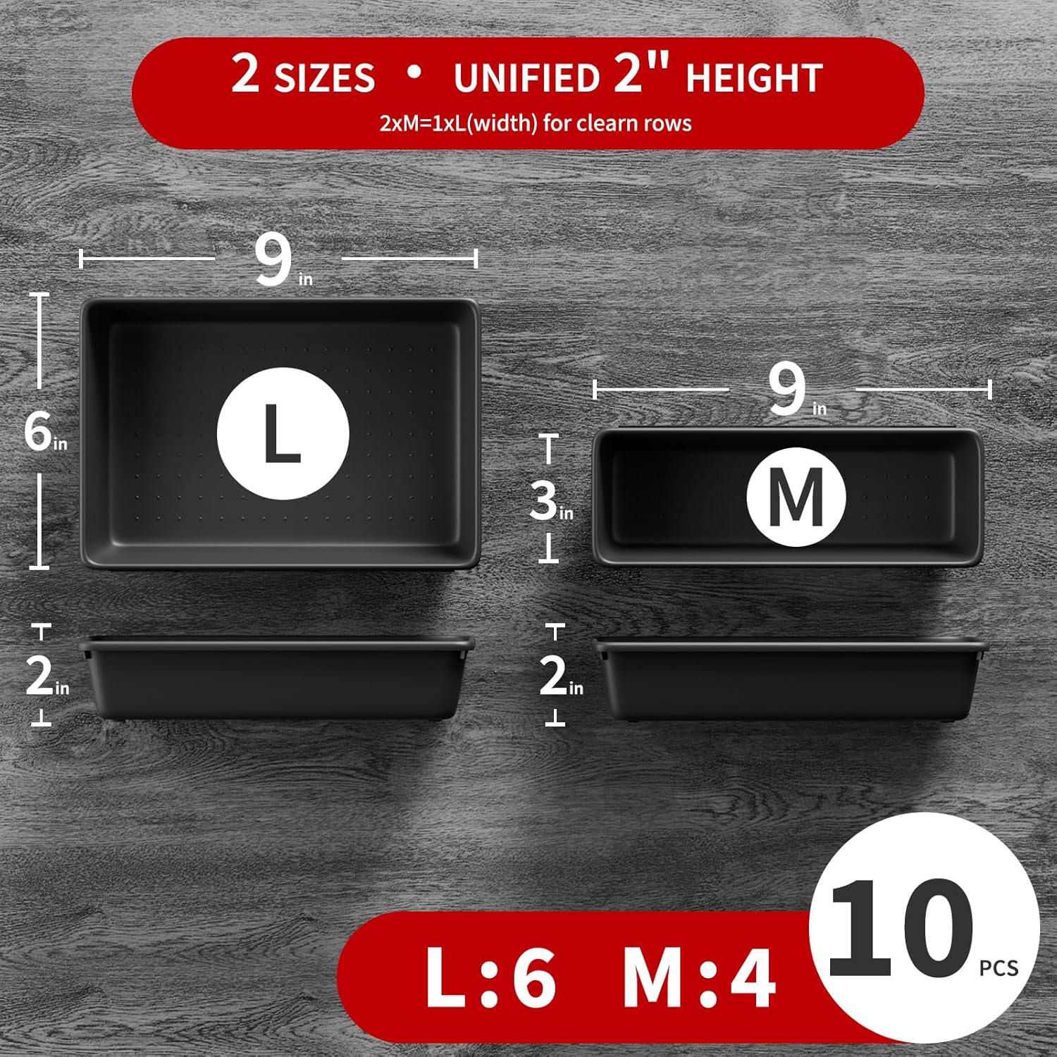 • 【Perfect Large & Medium Tool Tray Combination】Includes 6 Large (9"x6"x2") and 4 Medium (9"x3"x2") trays, ideal for hand tools, ratchets, wrenches, sockets, drills, and hardware. Fits tool box organizers and storage, garage cabinets, rolling tool chests, and workshop drawers.