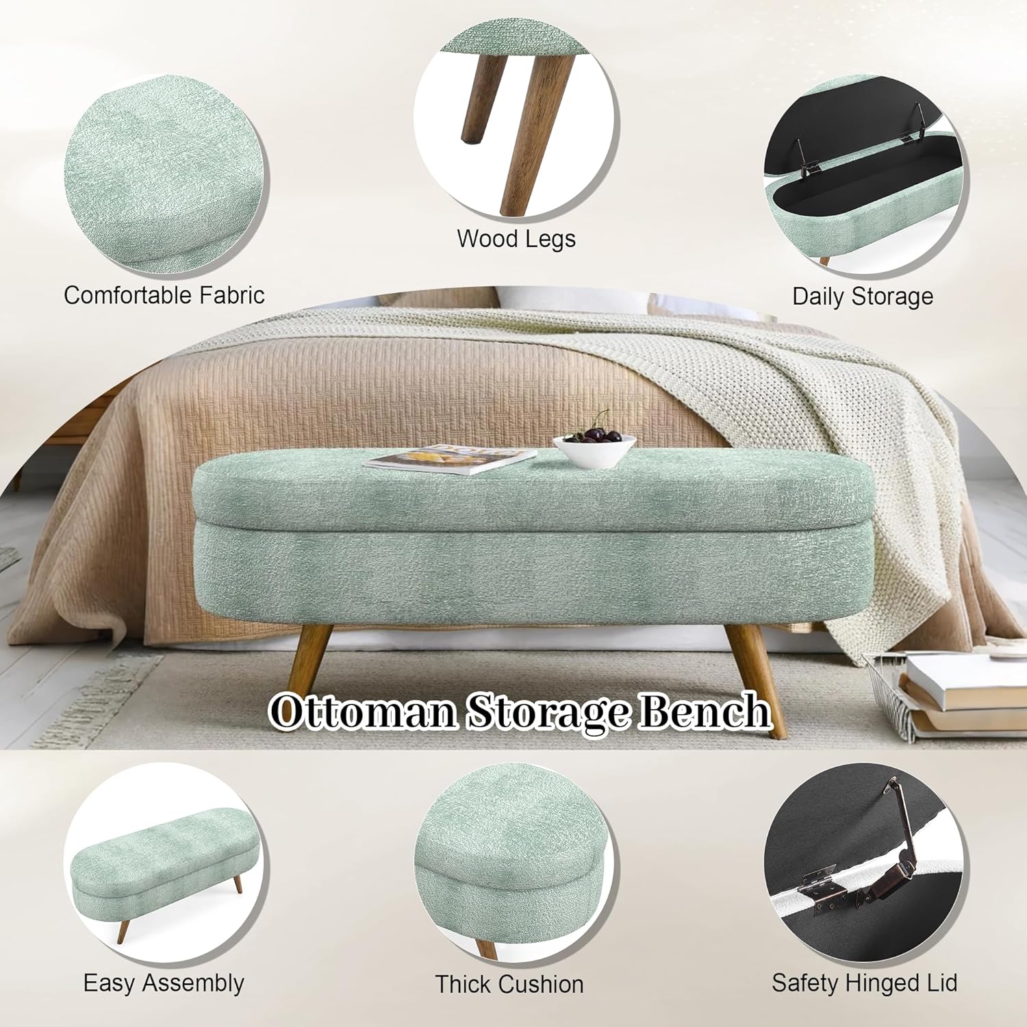 Storage Bench, 43" Storage Ottoman Bench, Shoe Storages Benches for Bedroom, Upholstered Entryway Benches with Seating, Rubber Wood Legs for Bedroom, Living Room, Entryway, Bed Side, Cyan