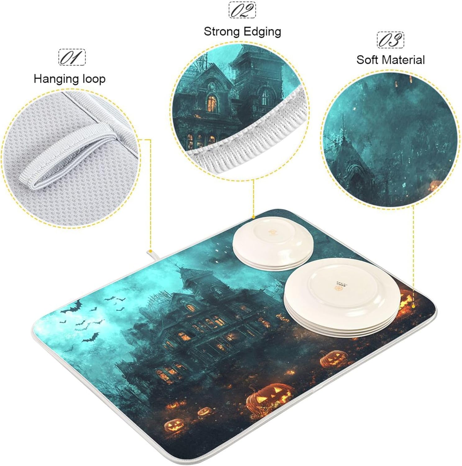 Halloween Castle Dish Drying Mat for Kitchen Countertop 18x24 Spooky Witch Pumpkin Lantern Large Drying Mat Reusable Quick Dry Dish Sink Mats Easy Clean Decorative Essentials