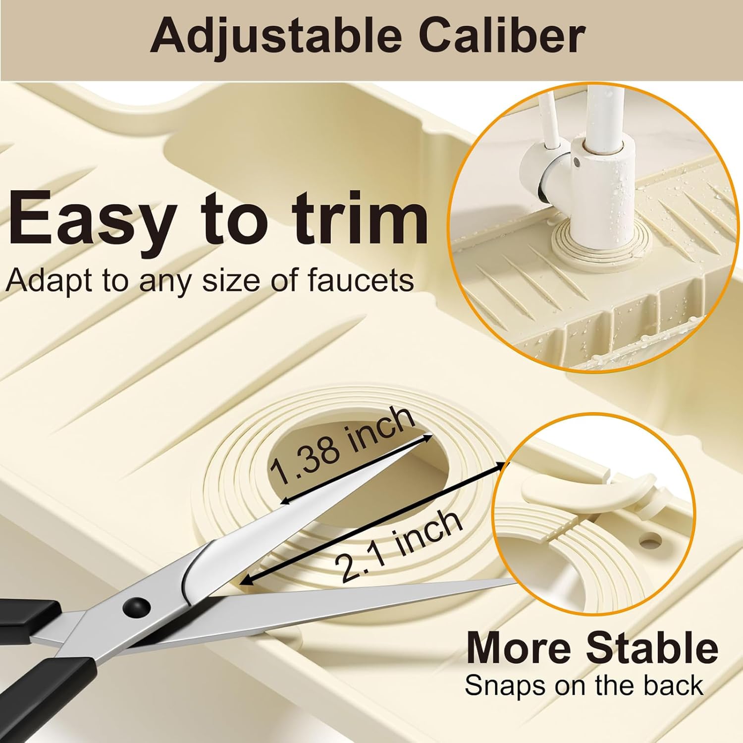 - Please Masure Before Purchase: The silicone faucet mat size is 17.91 x 4.33inch, 1.38~2.1 inch adjustable diameter single faucet hole. There is a lock of the hole at the opening to prevent the silicone mat from falling. Faucets larger than 2.1 inches in diameter will make the silicone faucet mat uneven after installation. For the best shopping experience, please measure your faucet before purchasing