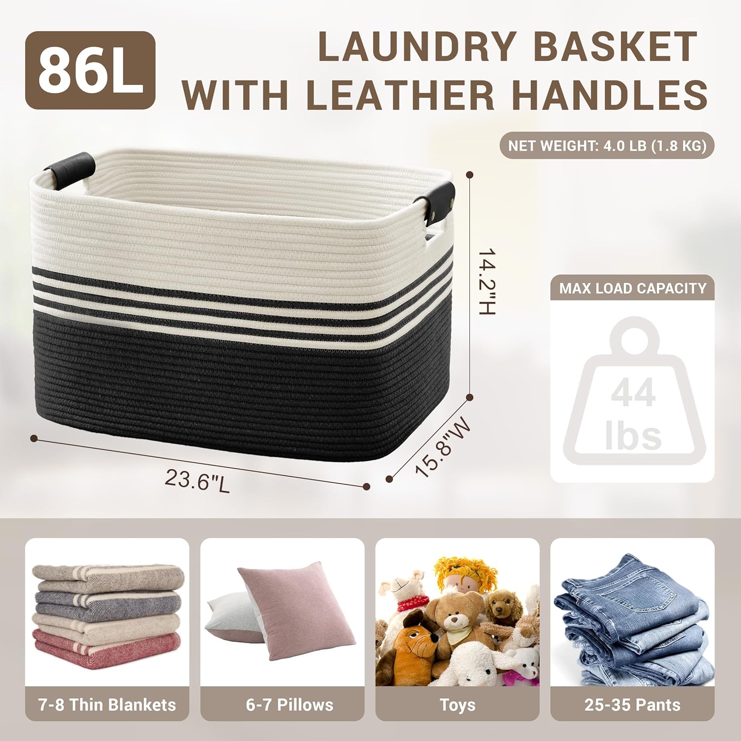 86L Extra Large Laundry Basket with Leather Handles for Living Room Storage, Woven Rope Baskets for Blanket, Kids Toy, Gifts, Wicker Hamper for Bedroom Dirty Clothes, 24"x16"x14" White Black