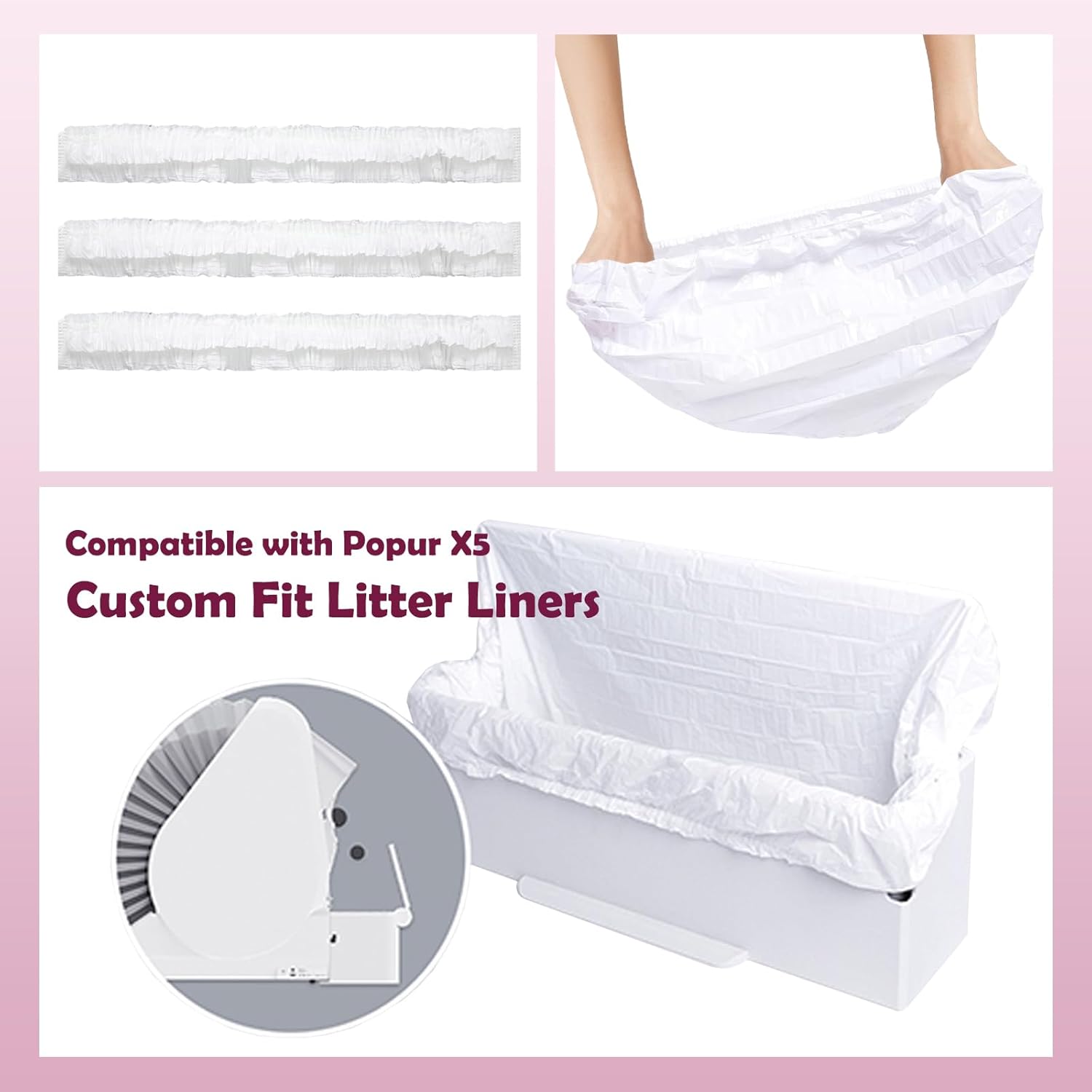 • PERFECT FIT FOR POPUR X5: Designed exclusively for the Popur X5 self-cleaning litter box, these elastic-band trash bags snap securely in place, preventing slips or spills. Ideal for hassle-free waste disposal.