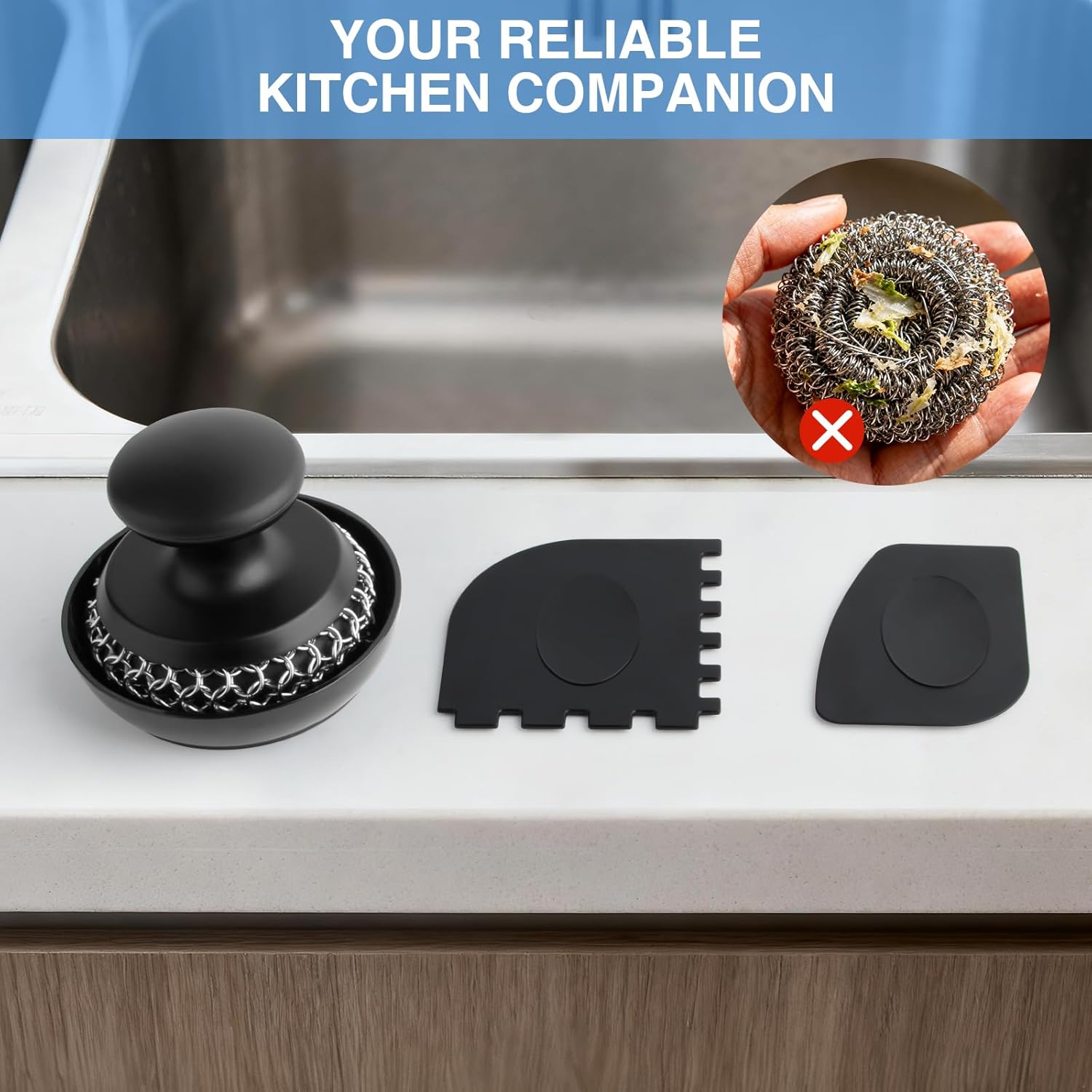 Cast Iron Scrubber Cleaner, Chainmail Scrubber for Cast Iron Pan Skillet, Dish Scouring Pad, Stainless Steel Brush/Scraper for Metal Skillet Scrubbing, Wok, Dutch Oven Cleaning Kit - Thick Mesh