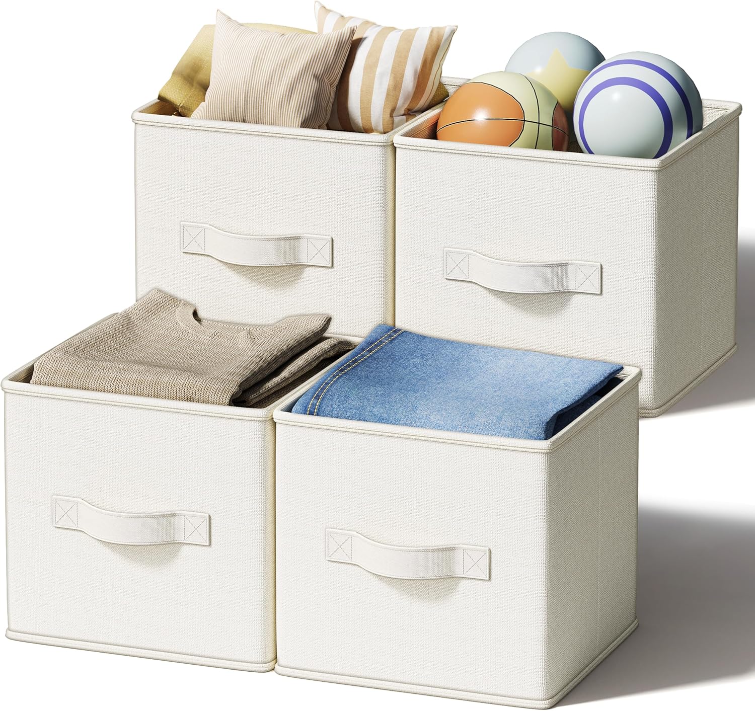 4 Pack Foldable Fabric Closet Storage Bins, 11Inch Organizer Cubes with Handles, Linen Storage Boxes for Clothes, Toys, Books and Home Organization, White& Ivory
