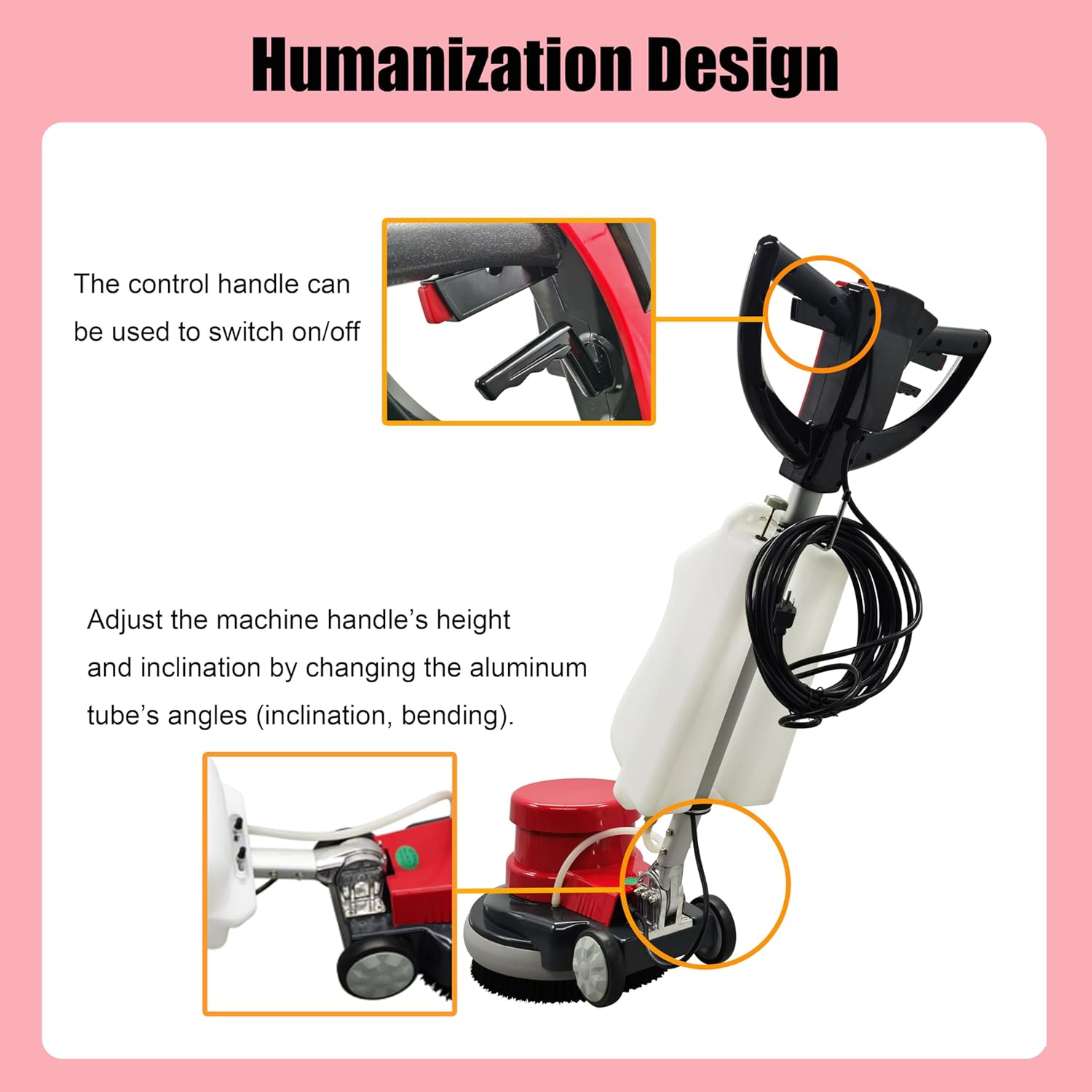• [Humanization Design] The control handle can be used to switch on/off the machine. Adjust the machine handle’s height and inclination by changing the aluminum tube’s angles (inclination, bending). The edge of the head of the Floor Scrubber is equipped with anti-collision rubber rings, making it safer. The two rubber wheels are anti-slip, wear-resistant and quiet.