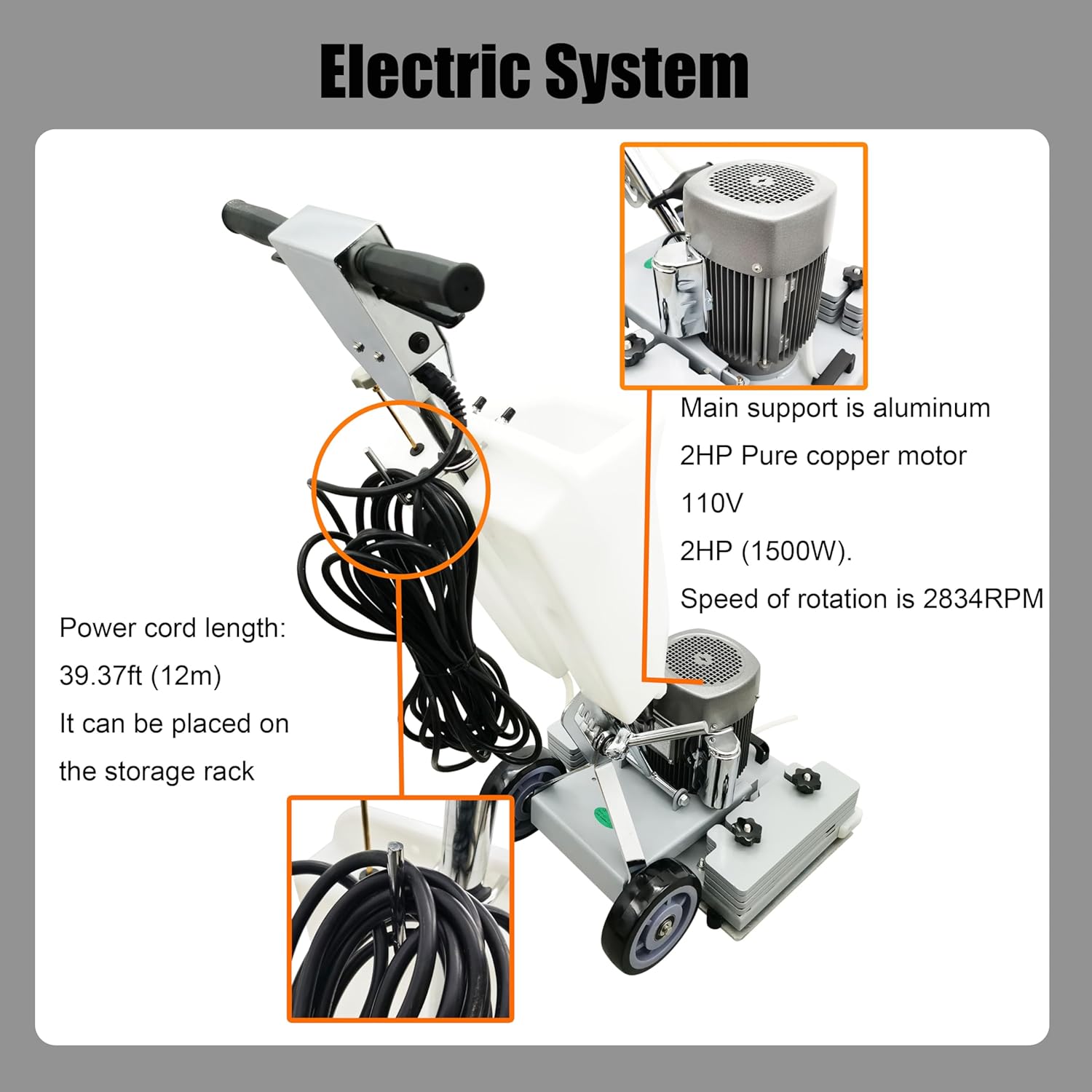 • [Electric System] The main support is made of aluminum and is lightweight. 2HP Pure copper motor’ s voltage is 110V. Power is 2HP (1500W). Speed of rotation is 2834RPM. Equipped with a power cord of 39.37ft (12m), when not in use, it can be placed on the storage rack, saving space and clean.