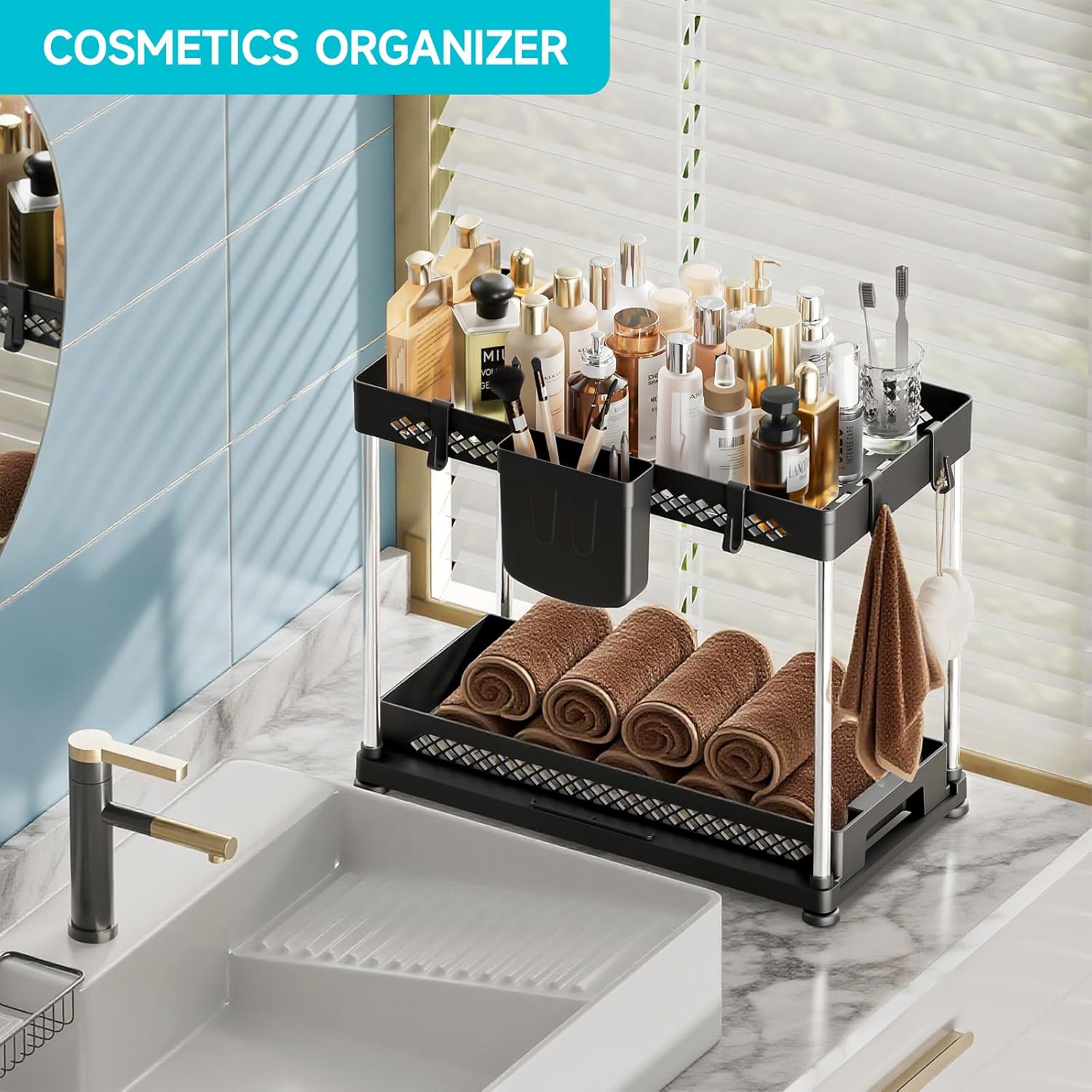 • MULTI-PURPOSE & STYLISH: Create valuable space in bathrooms, kitchens, pantries, or laundry areas. Featuring an intentionally simple design, this undersink organizer doesn’t just add space—it adds elegance to any cabinet interior