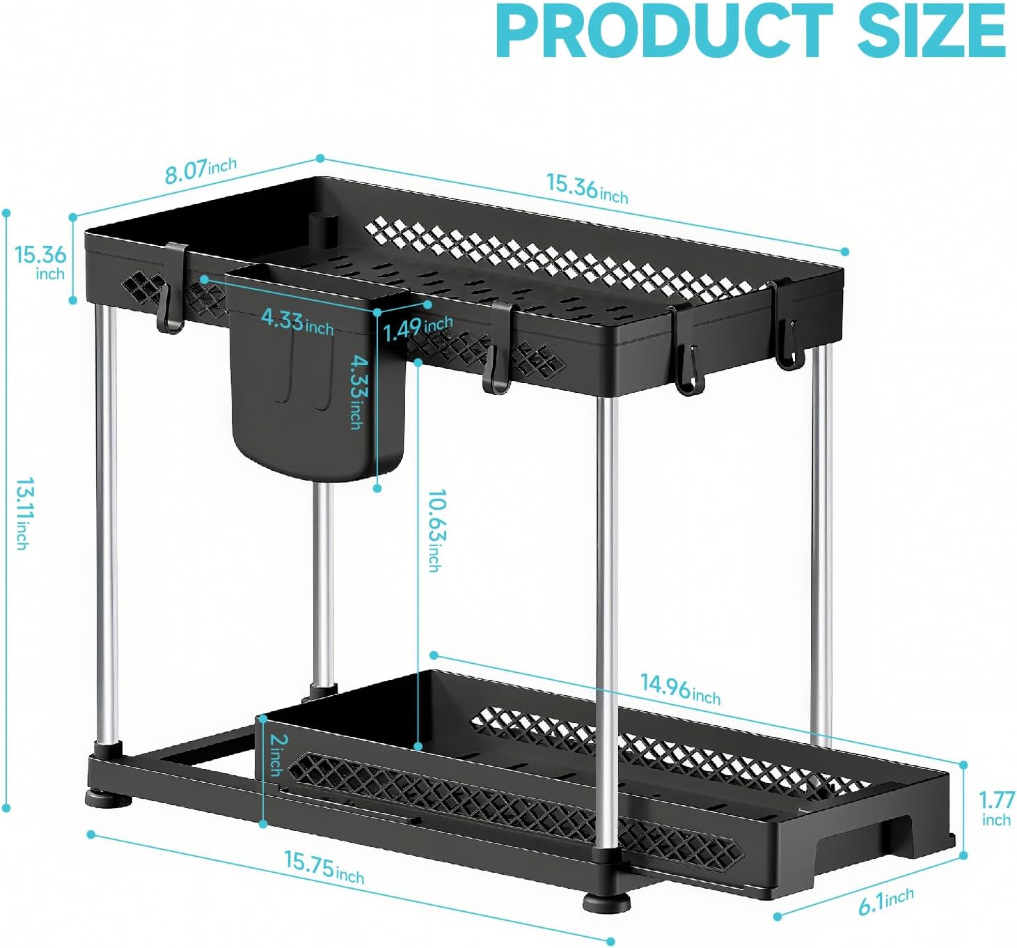 • DOUBLE YOUR CABINET SPACE: Designed with a larger capacity (15.35" x 8.07" x 13.11") and including extra hooks and removable hanging cups, this under kitchen sink organizer neatly stores all your essentials. (Pro tip: Be sure to measure your cabinet interior before purchase!)