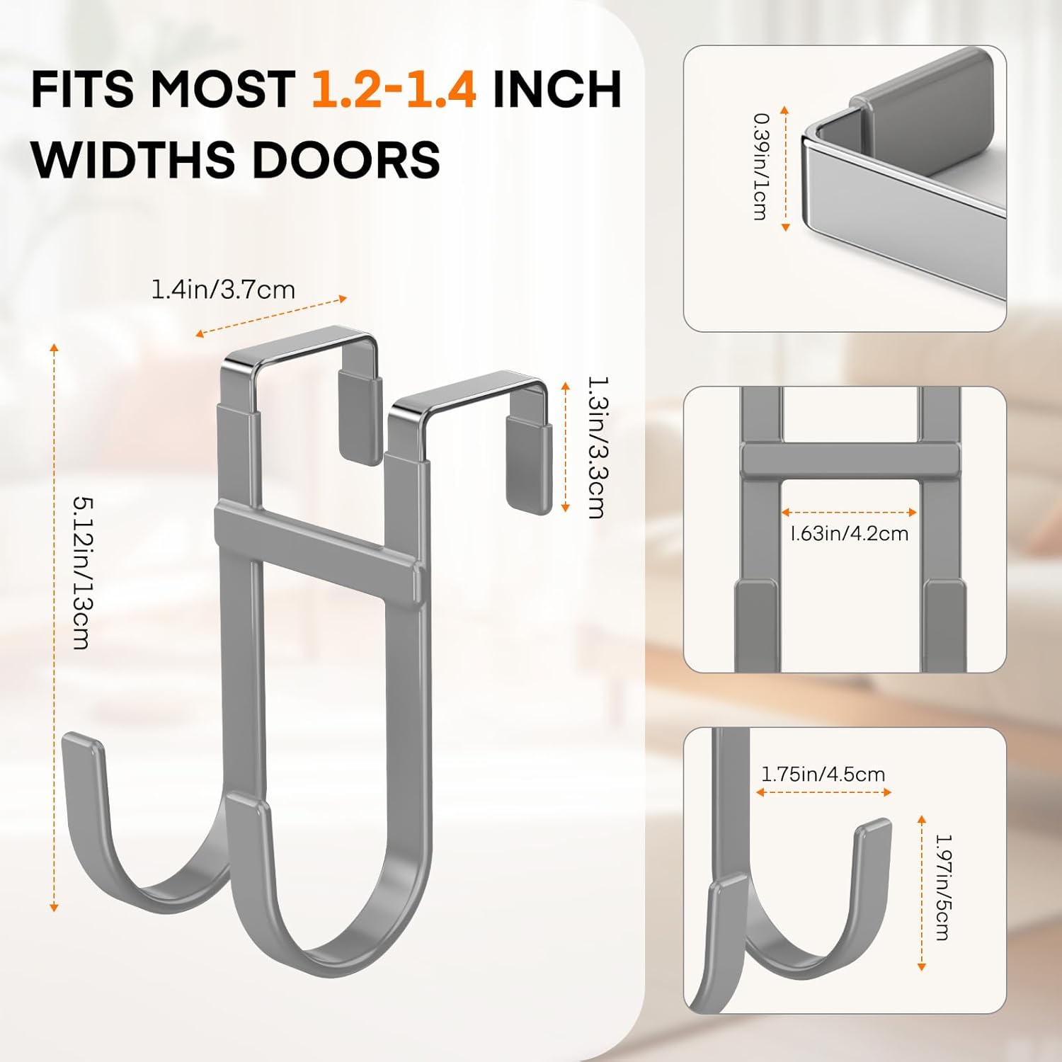 FYY Over The Door Hooks - 2 Pack Heavy Duty Dual-Hook Organizer Hanger with Non-Slip Rubber for Towels, Clothes, Hats & Bags Use in Bathroom, Bedroom, Kitchen - Fits Interior Doors Up to 1 3/8" Grey