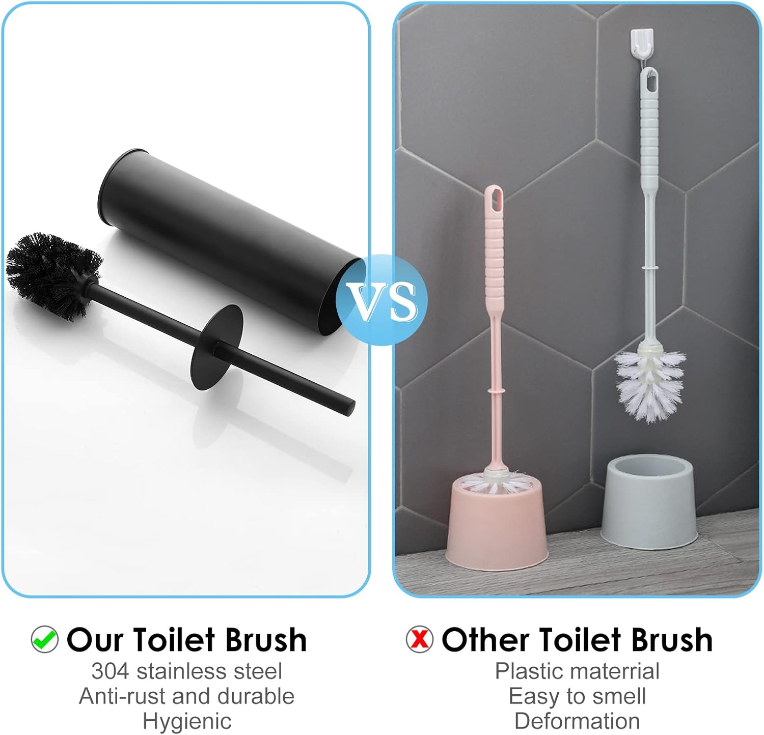 Toilet Brush and Holder Set Black Stainless Steel, 304 Heavy Duty Round Toilet Brush Set – Rust Resistant, Long Handle, Replacement Heads, Floor Standing Bathroom Toilet Cleaning Brush